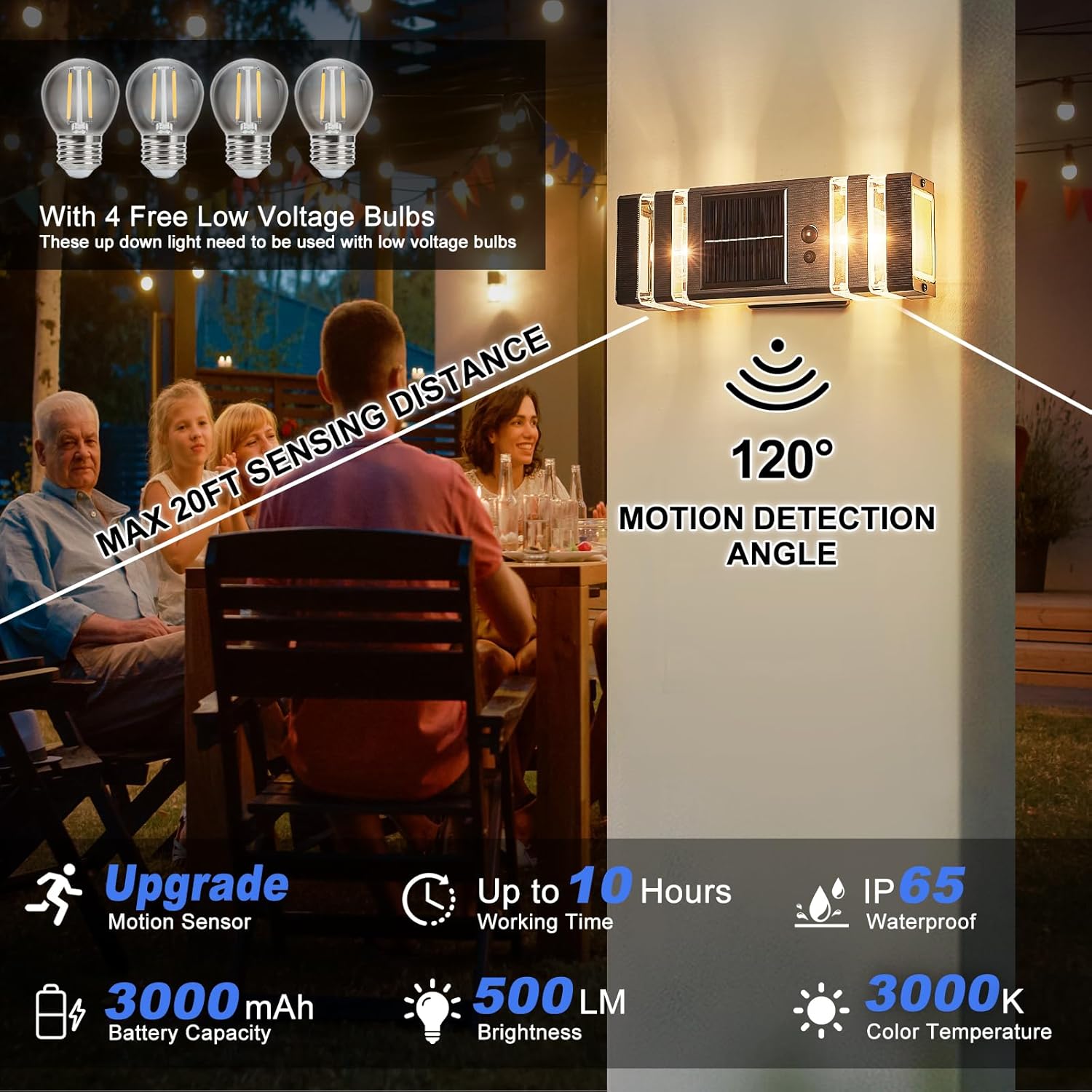 • 💡【INCLUDE 4 FREE 4W E26 3000K BULBS】These solar exterior light fixtures is compatible with all types of E26 base of low voltage light bulb. 💡Each DELICAVY solar sconce light is comes with 2 4W Low-Voltage LED warm white bulbs. 【If you need to purchase your own bulbs, it is recommended that you use 2 E26 low voltage bulbs within 2.3 inches in diameter and 3.7 inches in height.】