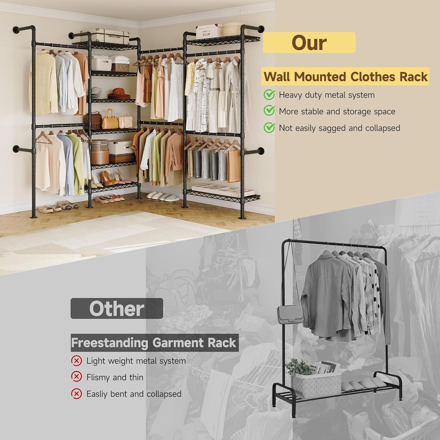 ONBRILL L4 Wall Mounted Industrial Pipe Clothing Rack, Closet Organizer System with 6 Hanging Clothes Rods ( 4 Expandable Rods) & 8 Shelves, Heavy Duty Corner Garment Rack, Large Wardrobe - Black