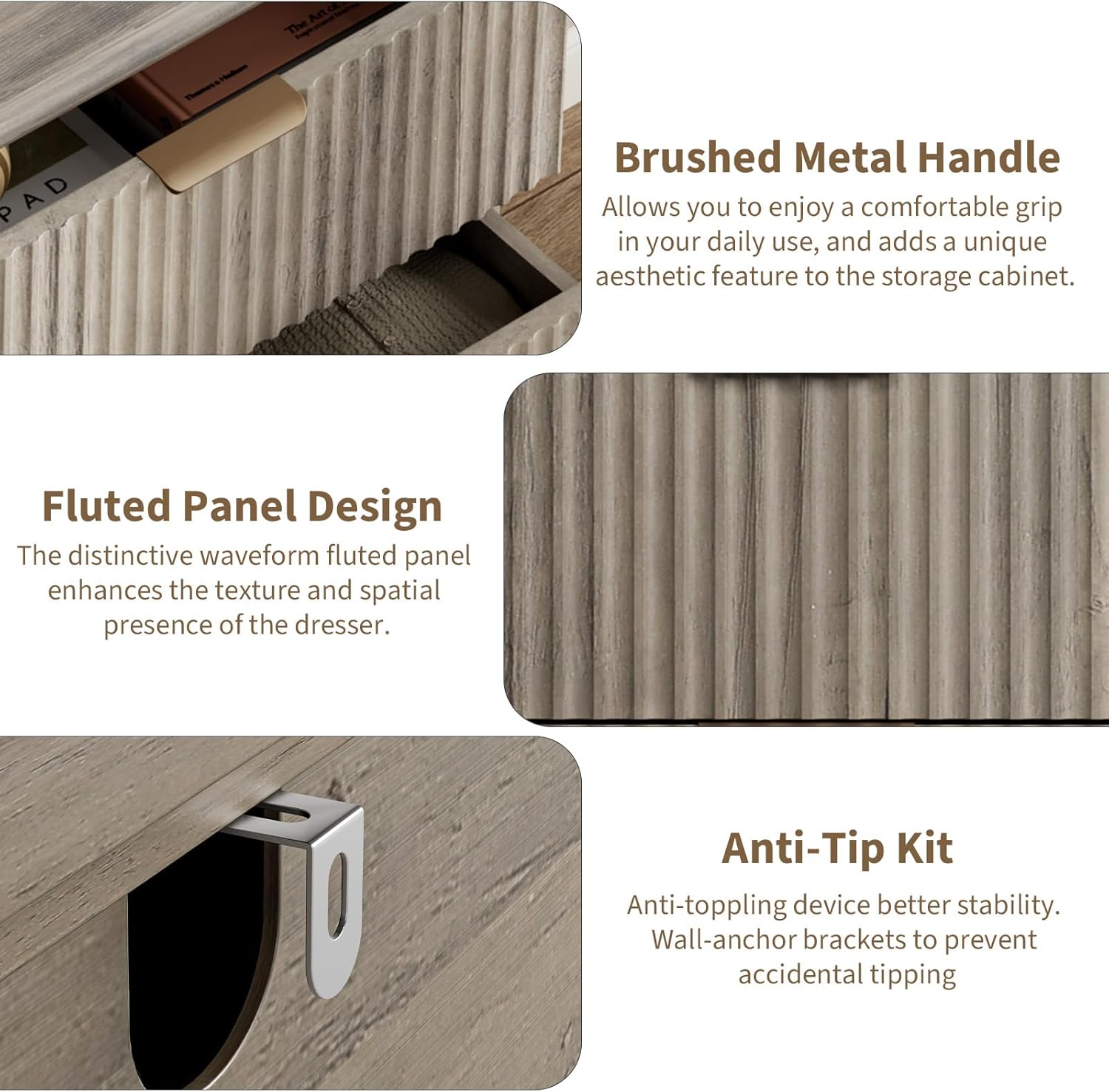 • Modern Chic Appearance: The unique wave-like fluted panel enhances the texture and elegance of this bedroom dresser. The thick table top features natural wood grain that complements the natural oak finish. The wide metal handle and splayed base legs add a modern touch, creating a personalized and distinctive appearance
