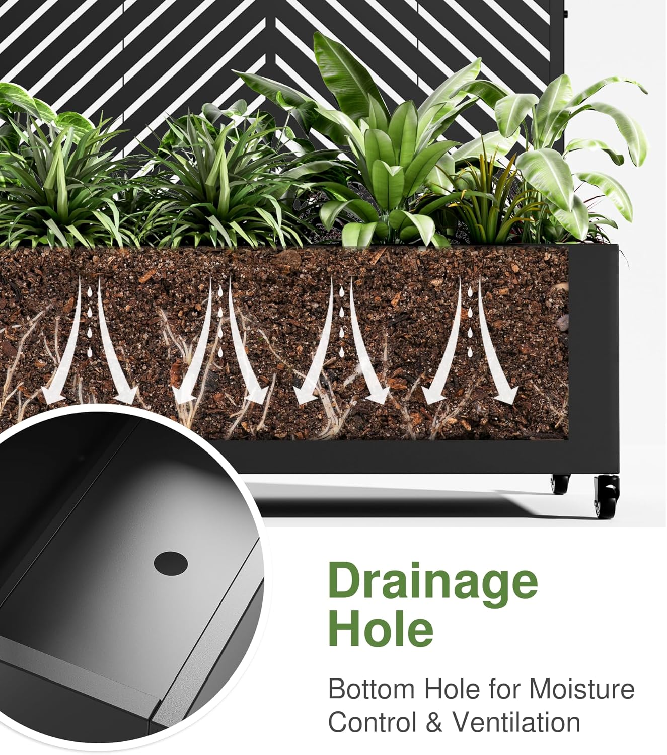 • Effective Drainage System: With a 12-inch deep planting bed and drainage holes, this planter prevents waterlogging, ensuring your plants receive the ideal moisture for healthy growth.