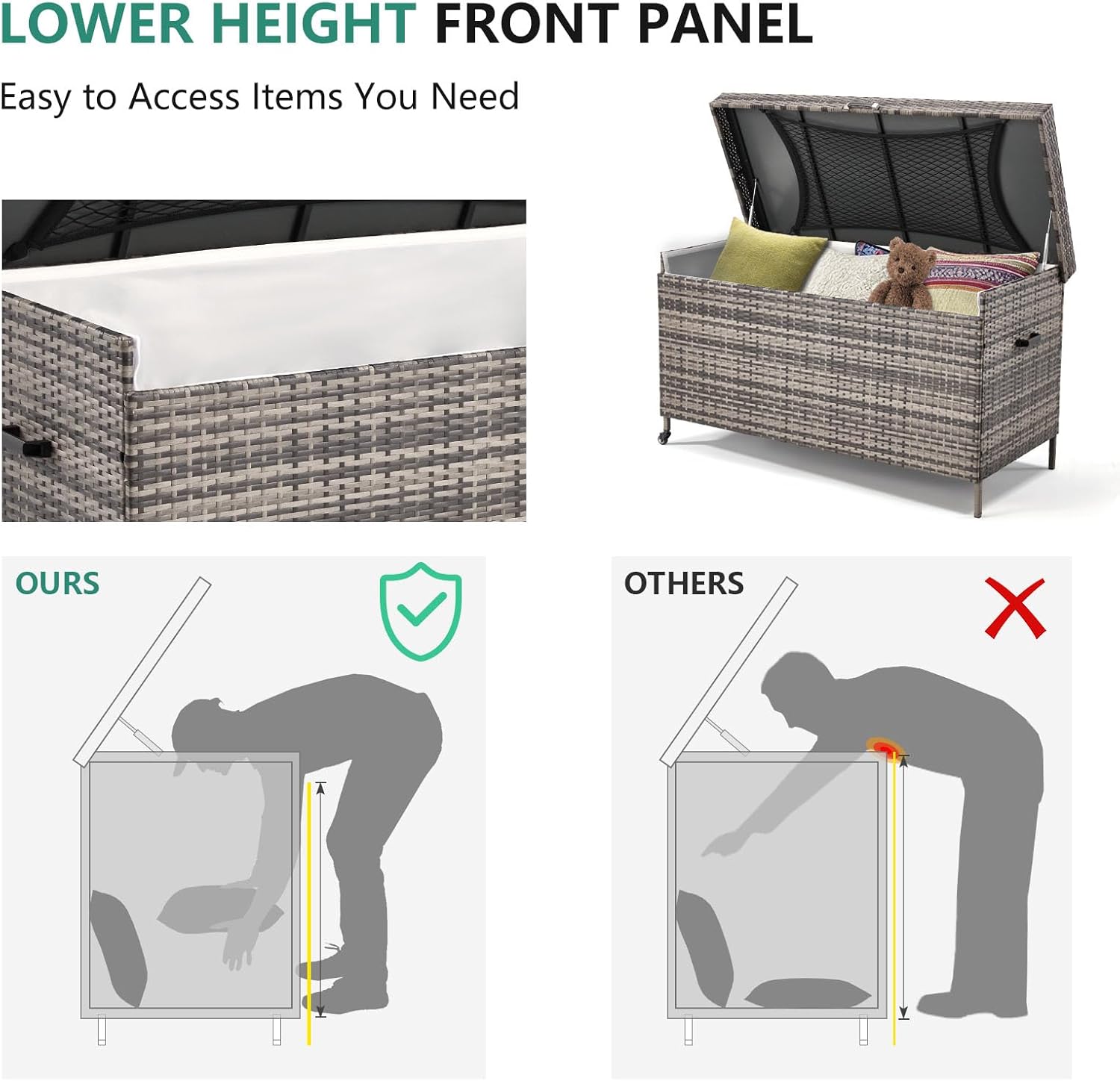 • Reliable & Hassle-Free: This large-capacity outdoor wicker storage box is equipped with high-quality pneumatic devices and sturdy metal hinges, ensuring a stable and smooth opening and closing process. With effortless operation and built-in protection against accidental pinching, it not only prioritizes safety but also makes organization a breeze
