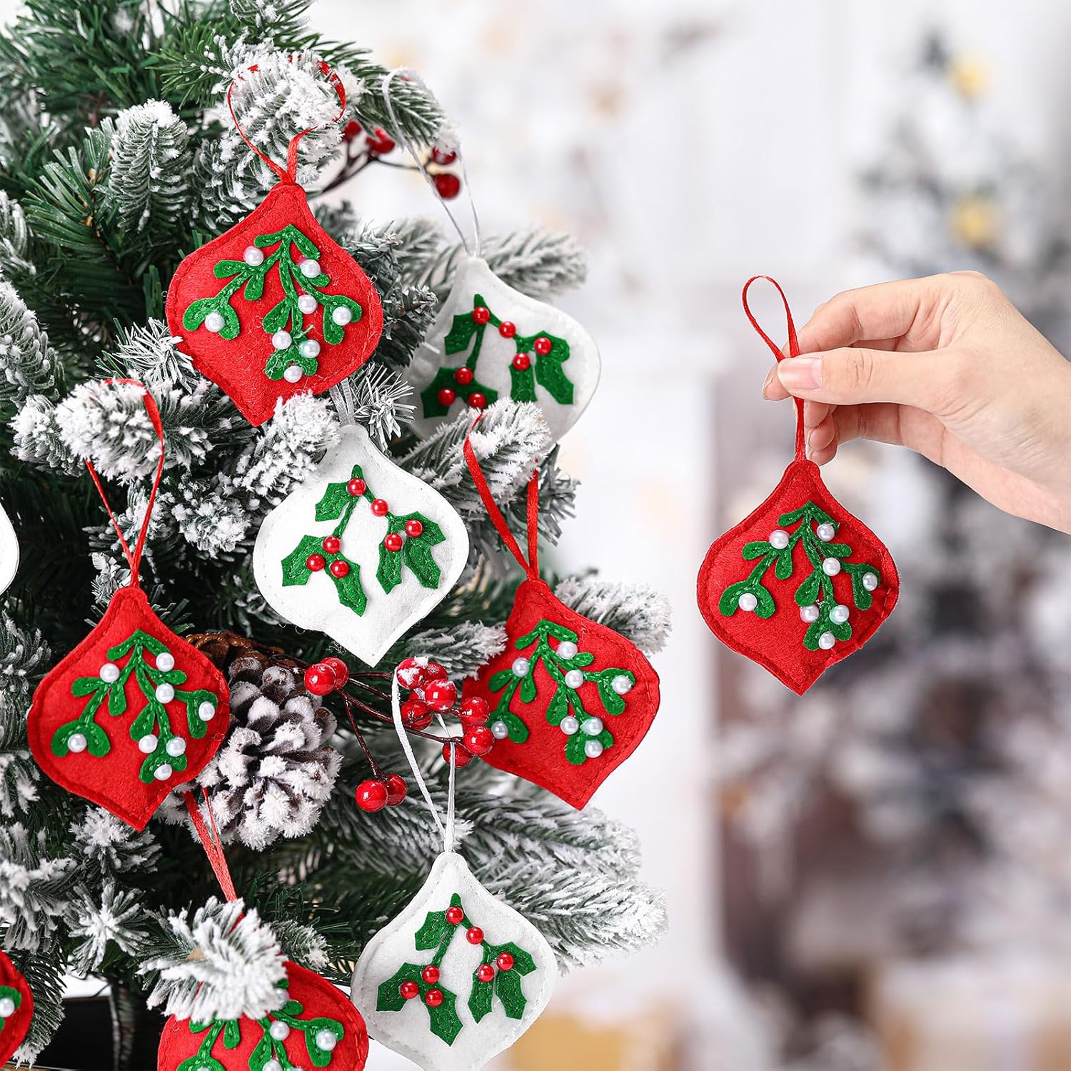 • Christmas 3D Elements: as you can see in the pictures, our felt Christmas ornaments come with 3D effect designs, embellished with popular Christmas colors, and shaped with classic Mistletoe and Holly leaves with Pearls style, which can create a strong festival atmosphere