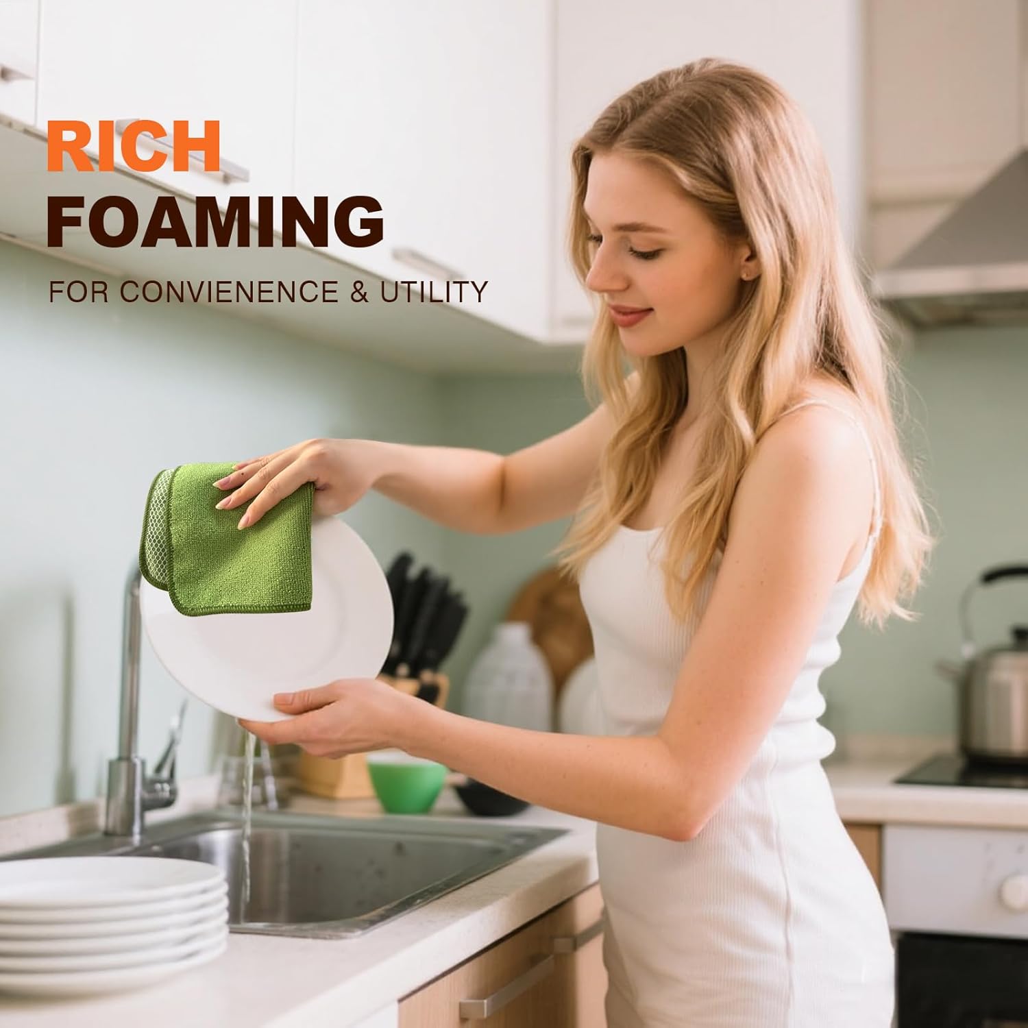 • DISH RAGS FOR KITCHEN CLEANING WITH POLY SCOUR SCRUBBING SIDE:Dish towels one side is microfiber and the other side is mesh. The microfiber side works well at getting finger spots off the stainless steel appliances and the glass front of fridge or stove, microwave; the scrubby side is good for cleaning stuck on food without having to grab your scraper and does not scratch delicate surfaces either