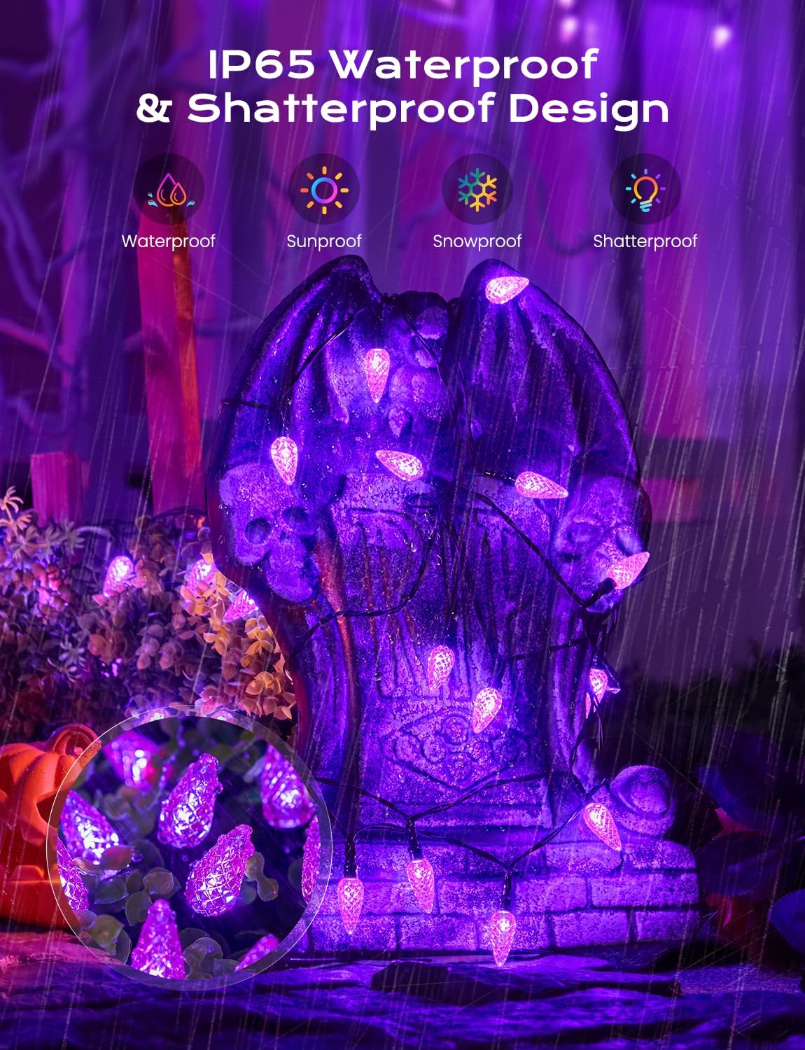 • [IP65 Waterproof] Sturdy plastic housing, waterproof plastic strip, enable the Halloween lights to prevent rain and water from entering effectively. Perfect for indoors and outdoors Halloween decoration, such aspatio railing, front door, house eaves, front porch, gazebo canopy, backyard, balcony railing, outside front window, front deck railing, front yard, Halloween tree etc