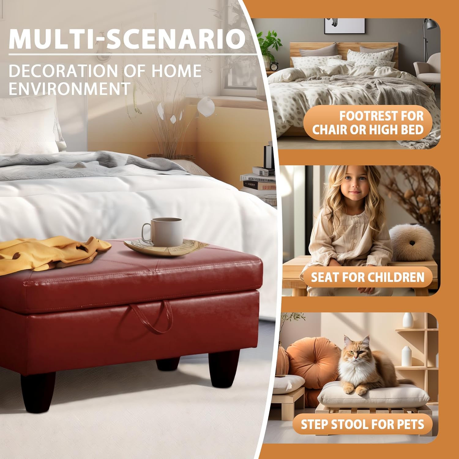 Ottoman Rectangular Storage Ottoman Bench, Faux Leather Footrest, Coffee Table, Stool Footstool with Hinged Lid for Living Room, Bedroom, Entryway, Red, 28.5"x19"x17.5"