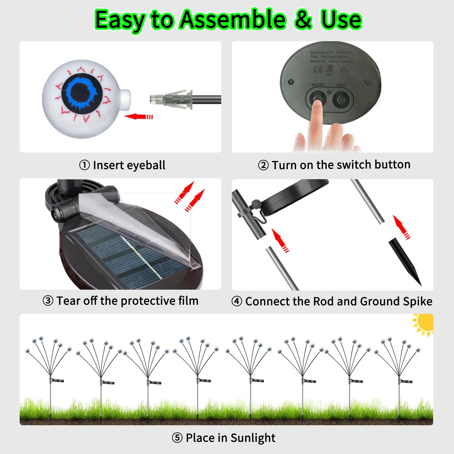 • Easy to Assemble & Widely Used: The outdoor solar lights just need insert the eyeball, then connect the rod and ground spike. They can be used in garden, yard , courtyard, path, lawn, terrace, and other places, it's the perfect choice for outdoor halloween decorations.