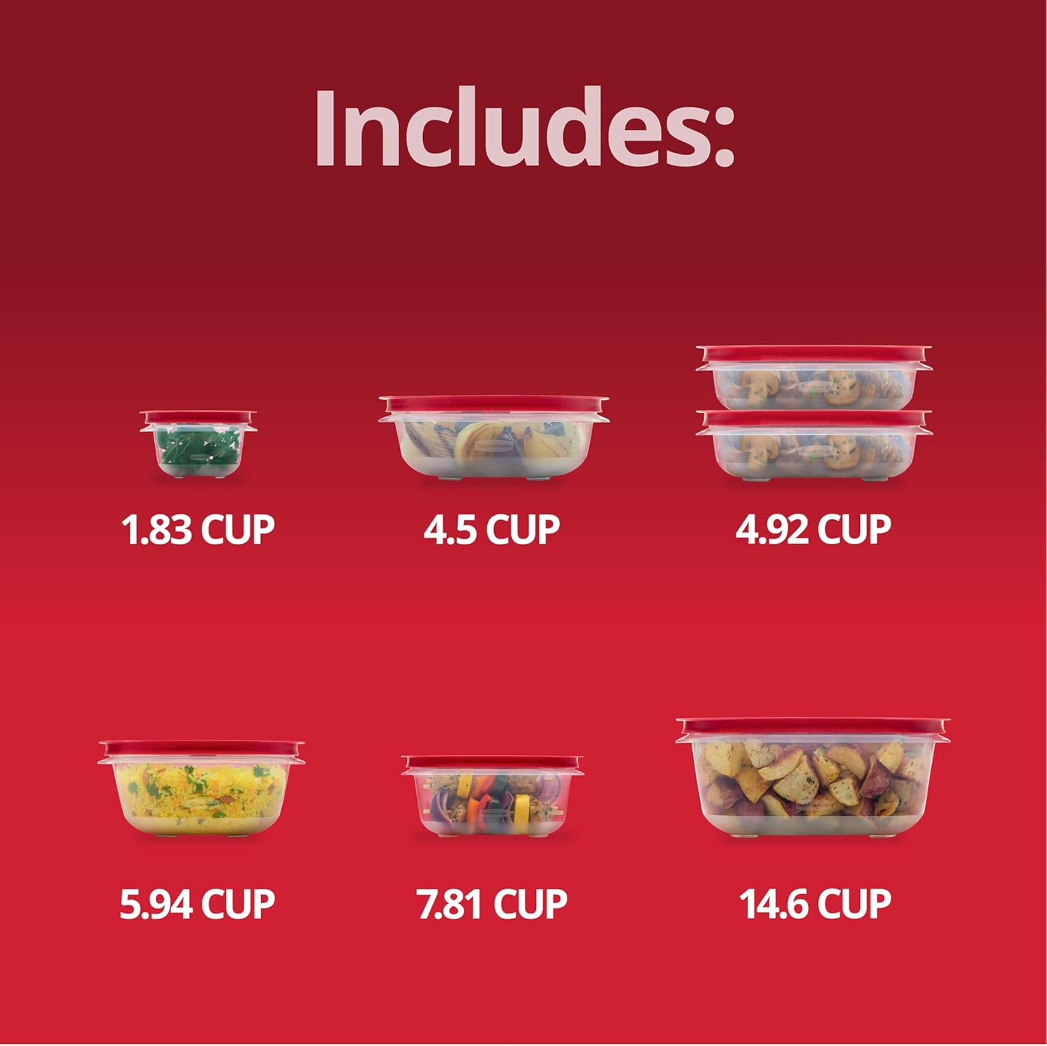 • Multiple Pieces: Includes one 14.66-cup container and lid, one 7.81-cup container and lid, two 4.92-cup containers and lids, one 1.83-cup container and lid, one 5.94-cup container and lid, and one 4.5-cup container and lid.