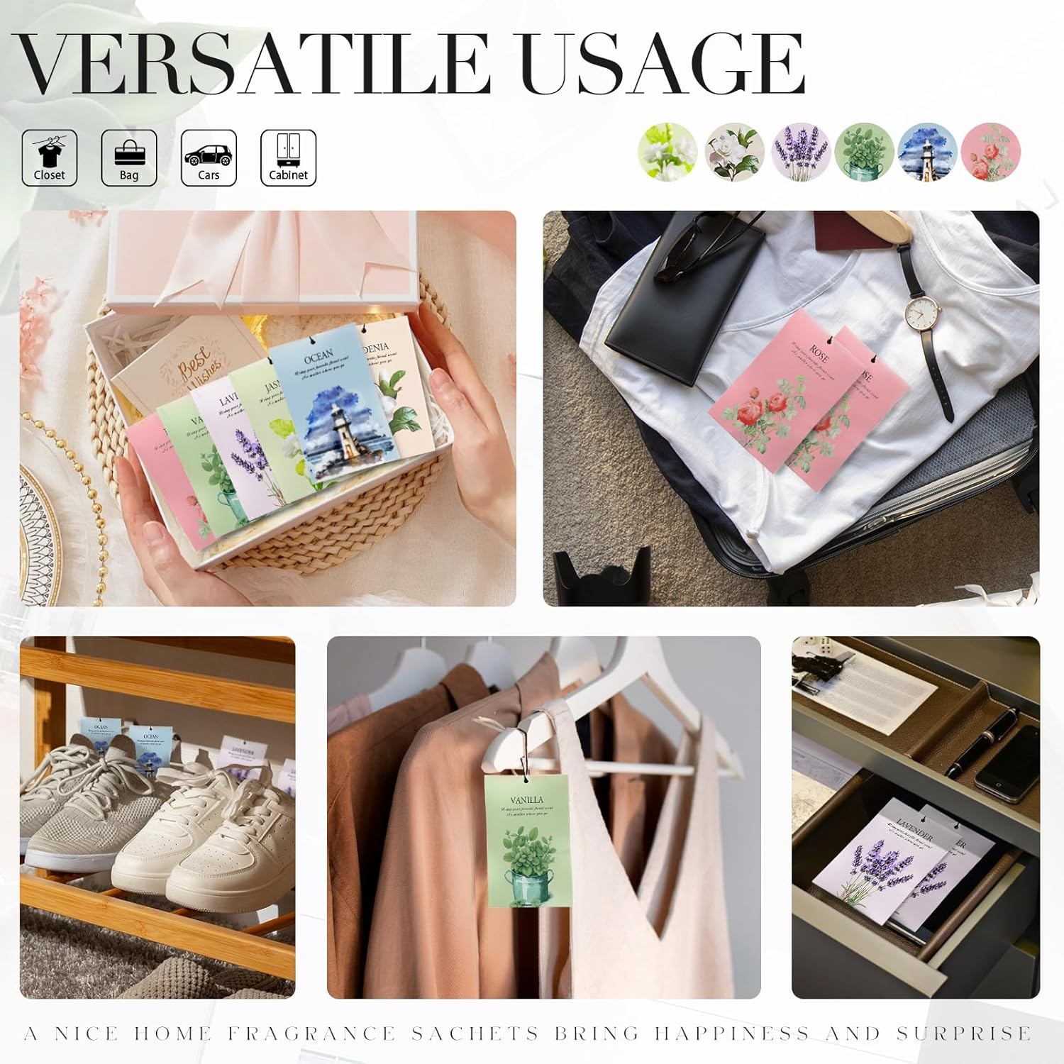 • 【Premium Long-Lasting Fragrance】Our scented sachets are designed to provide a consistent, pleasant aroma for 4-6 weeks when used in enclosed spaces. Each sachet contains carefully blended fragrances to refresh drawers, closets, and small areas.