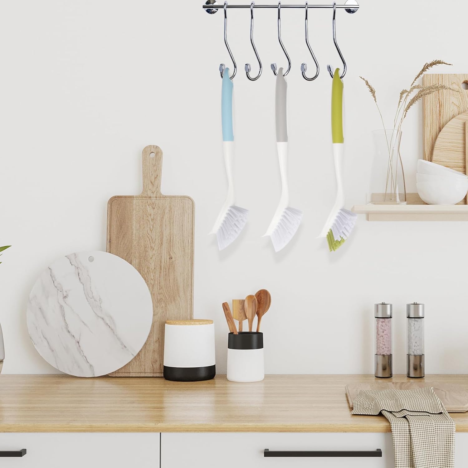 • Ergonomic Non-Slip Handle Dish Brush with Handle: Comfortable, long loop handle provides a secure grip, protects hands from wetness, and allows easy hanging for drying. Effortless heavy-duty scrubbing.