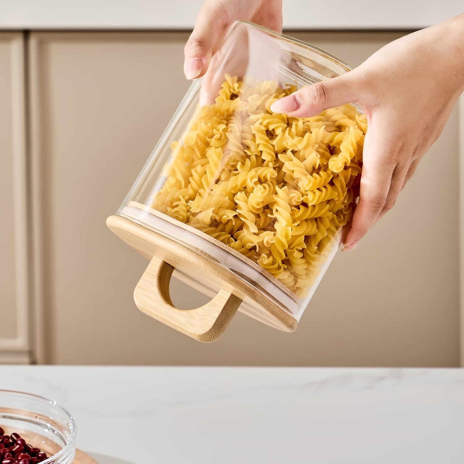 • Easy-Lift Seal Lid。 Unlike traditional bamboo lids, our jars feature a convenient lift-handle design for effortless opening and closing. The airtight seal keeps out dust and moisture, locking in freshness for dry goods like coffee, tea, and snacks.