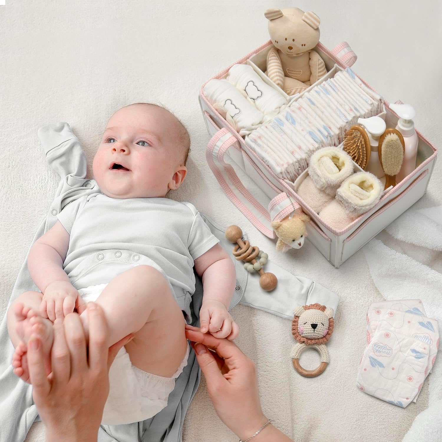 • MAXIMIZE STORAGE SPACE: Our 16x10x7 inch baby diaper caddy organizer holds all nursery must-haves—diapers, wipes, baby bath items, and mom essentials. Use it as a baby bath caddy, changing table organizer, or newborn gift basket for new moms.