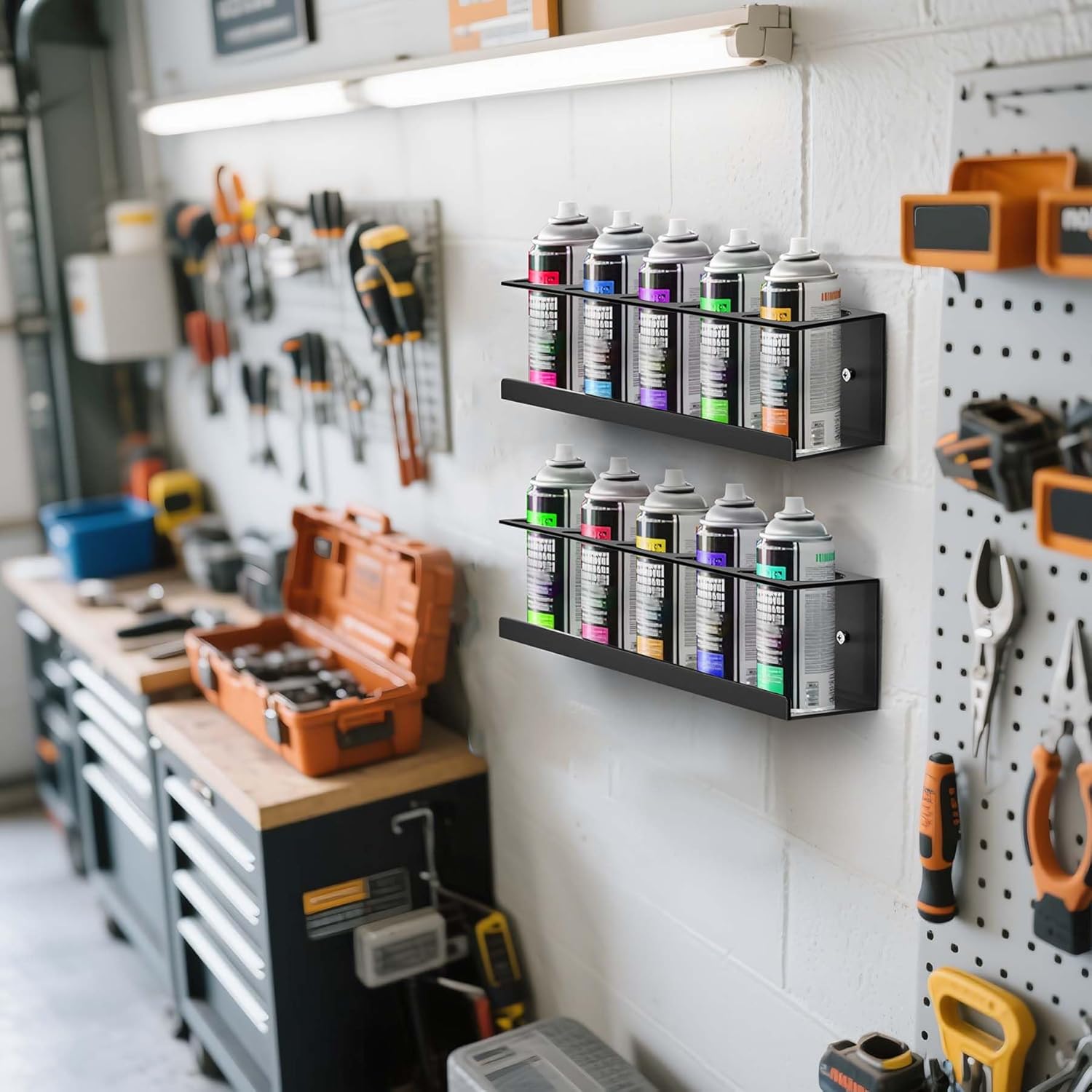 • Space Saving: Spray can holders are suitable for garage, store or home work space. You can arrange 4 spray can rack according to your preference, the wall-mounted design makes full use of wall space, eliminating ground clutter, keeping spray cans, cleaning agents and other tools within reach, and greatly improving the space utilization of garages, kitchens and workshops