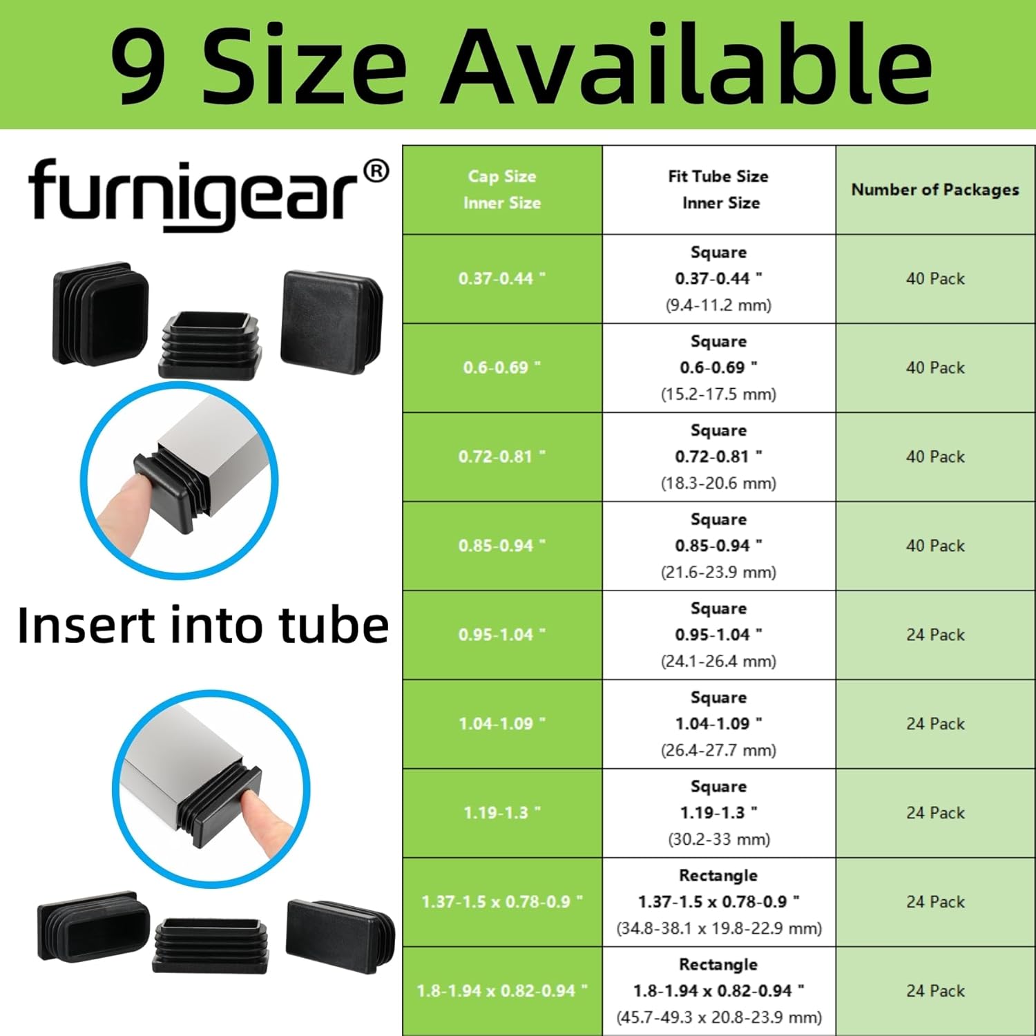 Furnigear Plastic Plugs Tubing End Cap Chair End Caps Outside Bottom Tubing Caps Square Furniture Sliders Glides Black (40, Fit 0.85-0.94" Square Tube Inner Size)