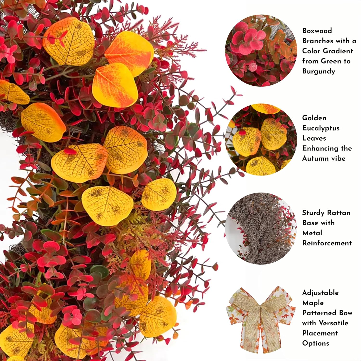 • Weatherproof: Crafted with premium weatherproof plastic, this large 24'' wreaths for front door withstands harsh outdoor elements from late summer to winter. Featuring fade-resistant foliage and reinforced frame, it maintains vibrant autumn hues through rain, snow and UV exposure - ideal for year-round porch or garden display.