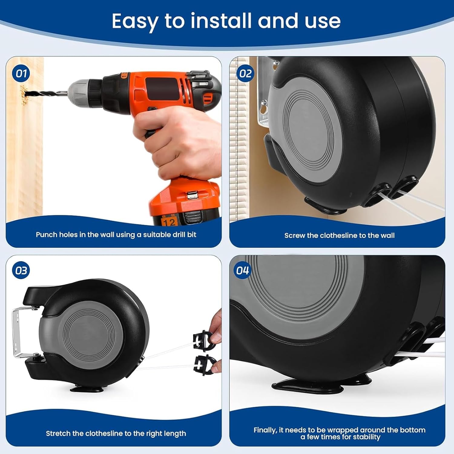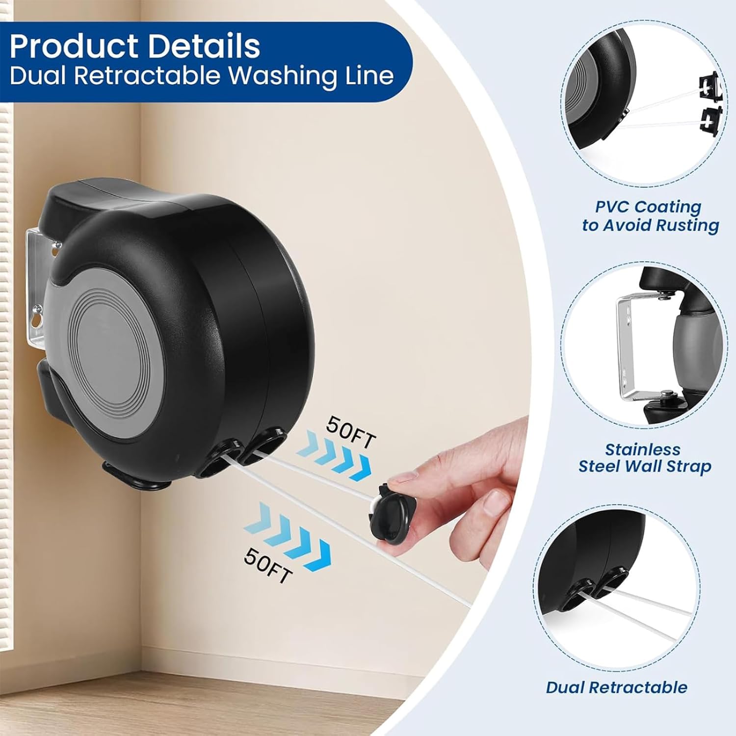 • Dual Retractable Lines for Maximum Drying Space – Enjoy nearly 100 feet of total hanging space with two retractable clotheslines, each measuring approximately 49 feet. Perfect for both indoor and outdoor use—laundry rooms, bathrooms, balconies, backyards, and more.