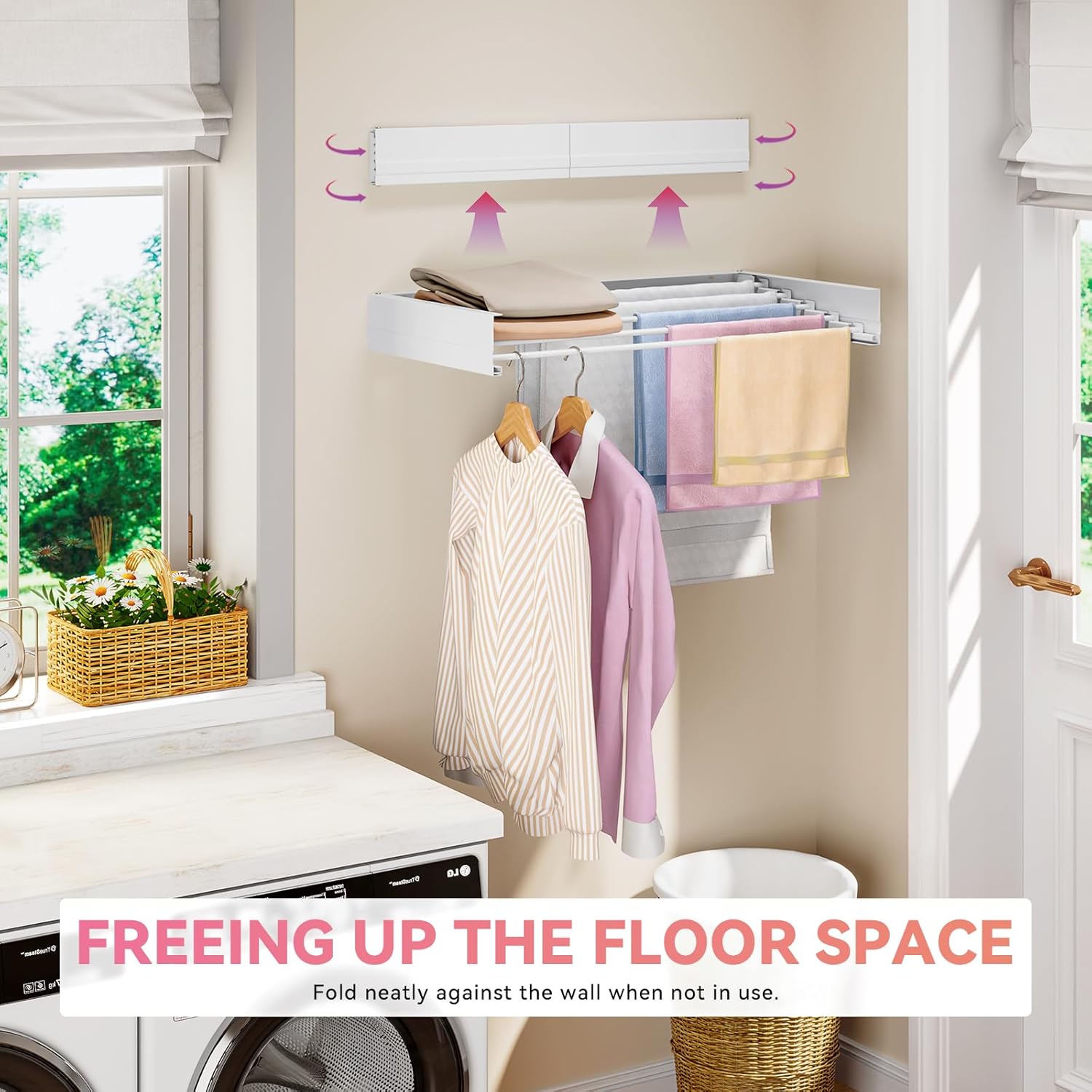 • Space-Saving Pro - The retractable clothes drying rack folds flat against the wall in less than 1" thick, making it perfect for small spaces like bathrooms, balconies, and laundry rooms without sacrificing drying capacity.