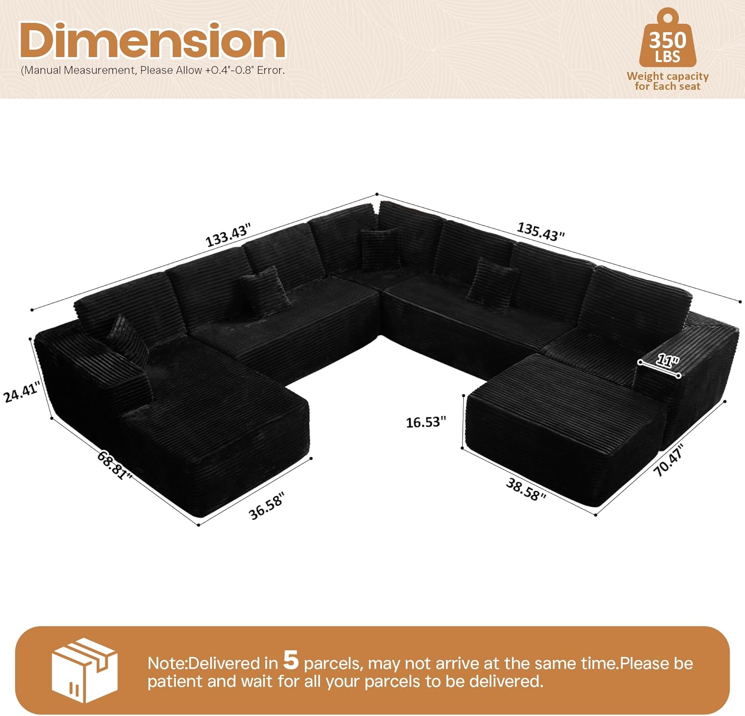 Cloud Sectional Couches for Living Room,G Shaped Modular Sofas No Assembly,135x133 Inches Plush Corduroy Oversized Floor Couch Set with Deep Seat Chaise,Black