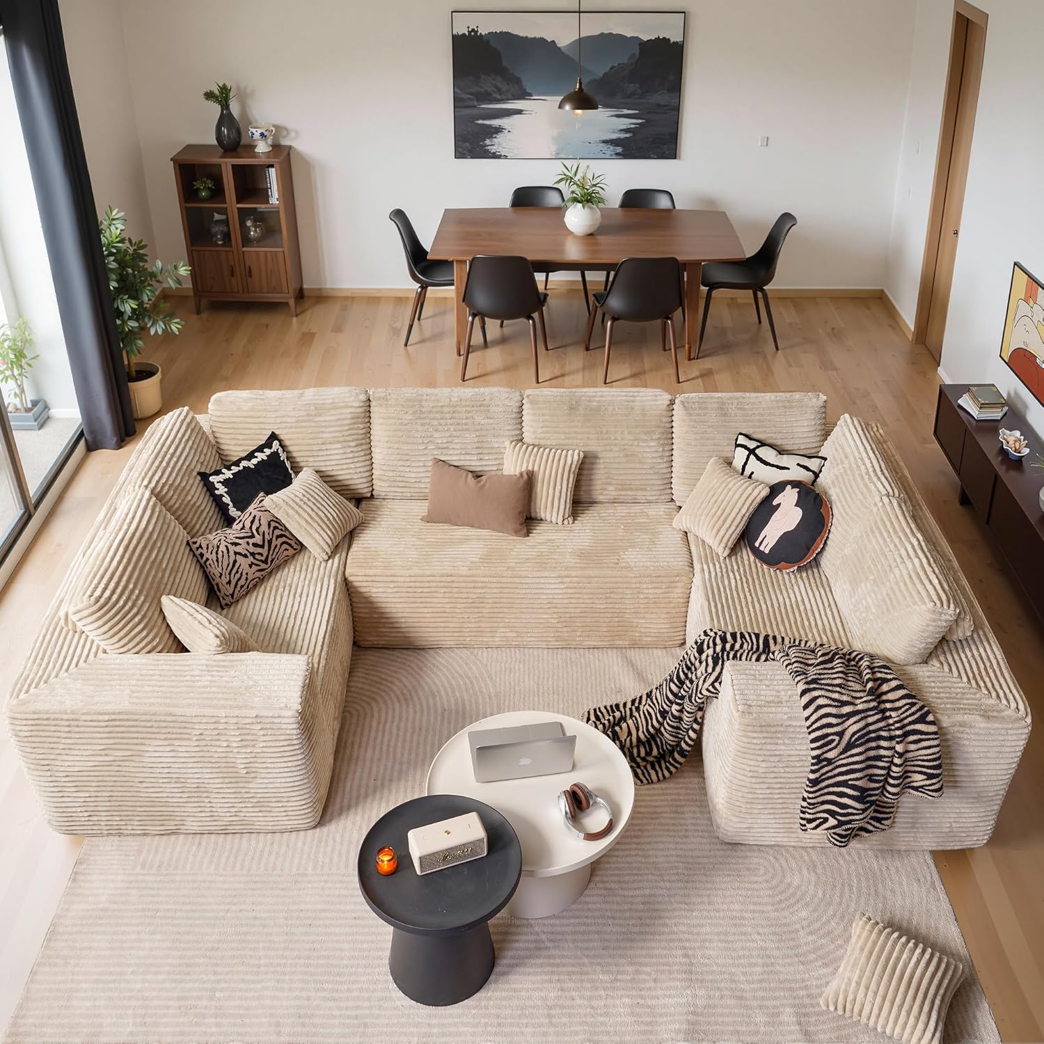 Cloud Sectional Couches for Living Room,U Shaped Modular Sofas No Assembly,135x79 Inches Plush Corduroy Oversized Floor Couch Set with Deep Seat Chaise,Beige