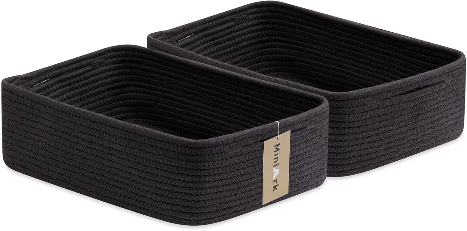 Large Shallow Organizing Baskets 15x11x5.1 Inches - Rope Woven Storage Bins for Bathroom, Shelves, Cube Closet, Black 2 Packs