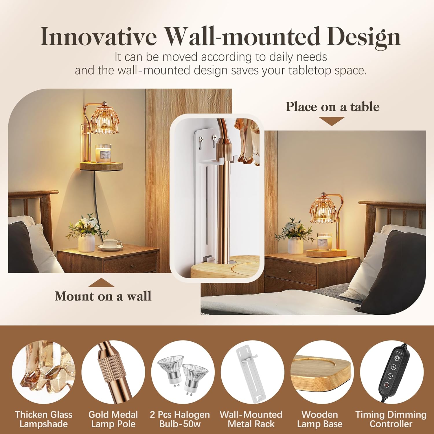 Candle Warmer Lamp with Timer Dimmer, Modern Wax Warmer for Scented Wax Jar Candle Warmer with 2 Bulbs, Adjustable Height Glass Lamp for Gifts for Women, House Warming Gifts, Home Decor, Gold Amber