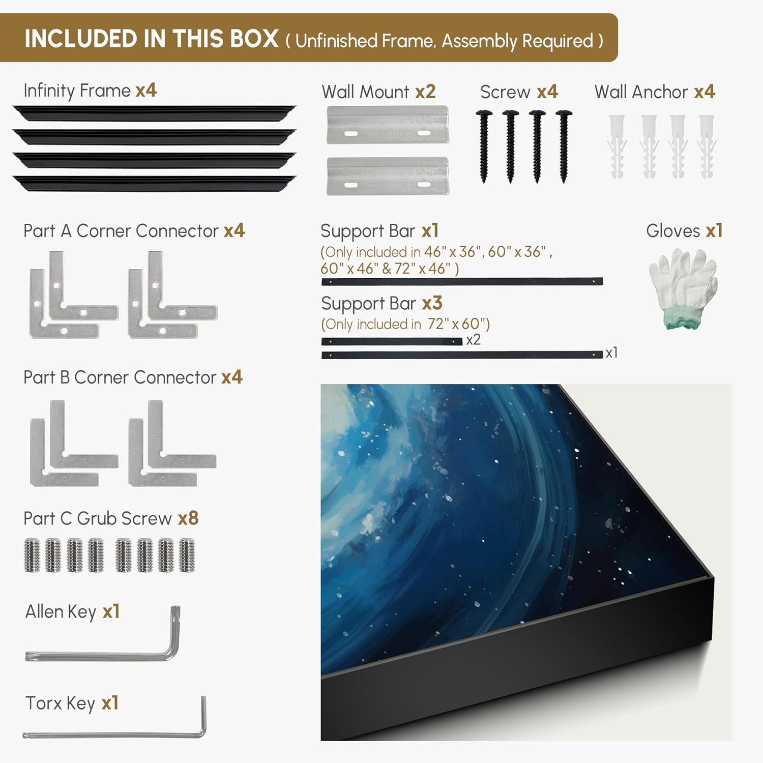• Assembly Required: The artwork comes with the frame components unassembled. Don¡¯t worry - setup is straightforward and tool-friendly. For best results and accurate alignment, we recommend two people to ensure a smooth assembly and a stable, secure wall mount.