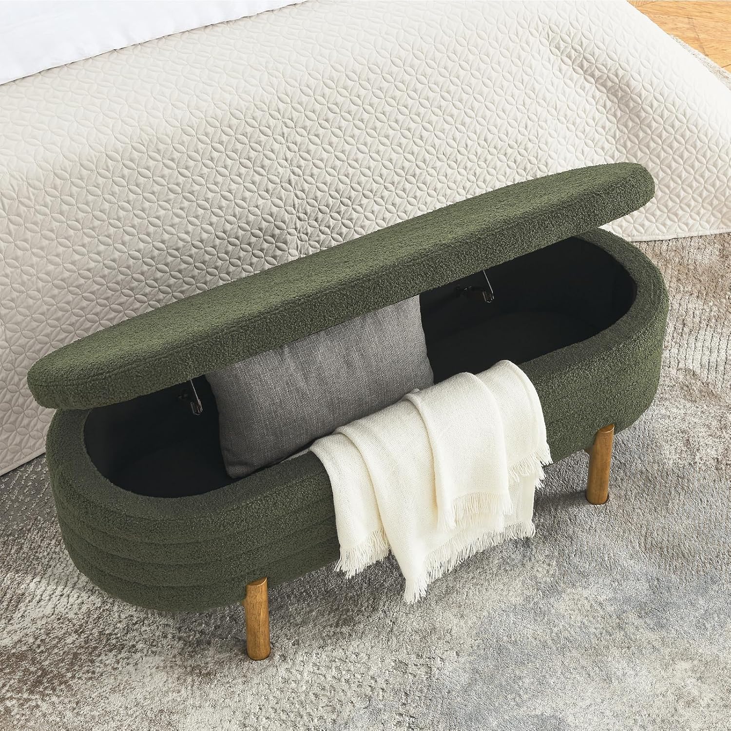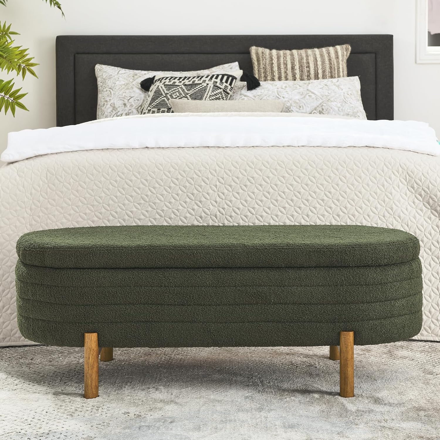 • ·Modern Design: Our storage ottoman showcases deep button tufting and elegantly rolled arms, capturing the essence of a truly modern piece. With a sophisticated structure, this bedroom storage bench embodies a minimalist style that prioritizes comfort and practicality.Diamond Stitch Button Tufting: The button-tufted stitching on the lid enhances the modern designthis of this end of bed bench. The diamond stitch pattern introduces subtle texture while maintaining optimal comfort.