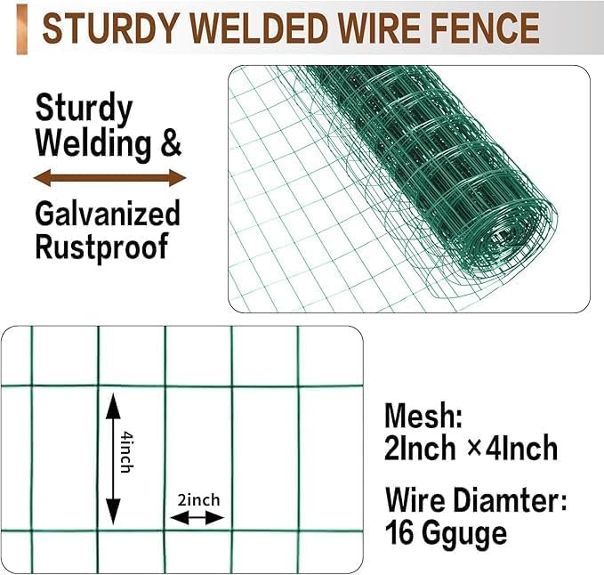 • Sturdy Welded Wire Fence: This welded chicken wire fence manufactured using advanced welding technology to ensure that each solder joint is strong and durable,features a 16GA wire diameter, with 2 inch x 4 inch mesh openings, sturdy enough to effectively protect your yard and poultry safety.