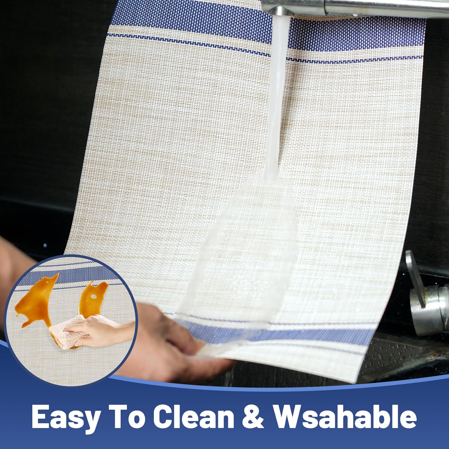 • 【East To Clean】——The washable placemats can be washed repeatedly.How to clean the place mats for kitchen table:Simply wipe with soap,water and a soft sponge or cloth.Scrub stubborn stains with a soft bristle-brush and a bleach-based cleanse.