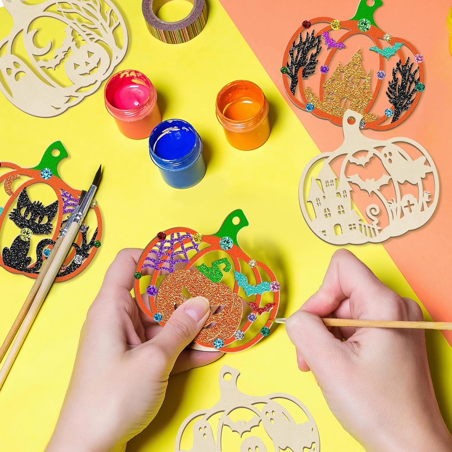 80PCS Wooden Halloween Decoration Pumpkins Ornaments to Paint Happy Halloween Cutouts Unfinished, DIY Blank Unfinished Ghost Spider Web Black Cat Trick or Treat Boo Ornament for Home Crafts Hanging