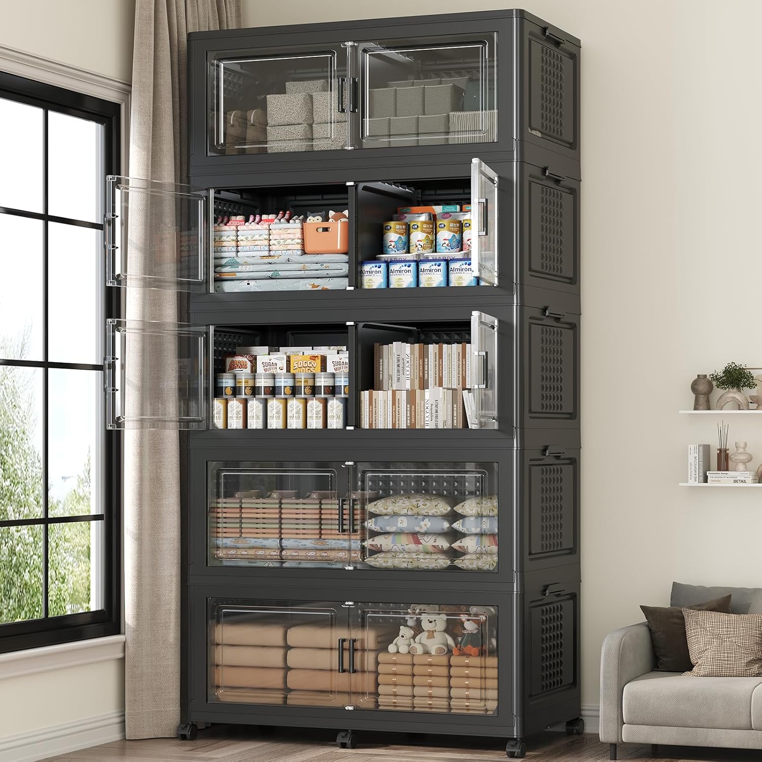 • 【Two Ways to Open & Clear Magnetic Door】The collapsible storage bins with lids and wheels feature a dual access way, allowing for both top and front door openings, and with clear windows for easy visibility. The stackable plastic storage bins with open front doors are equipped with magnetic lock buckles to prevent dust from entering the cabinet.