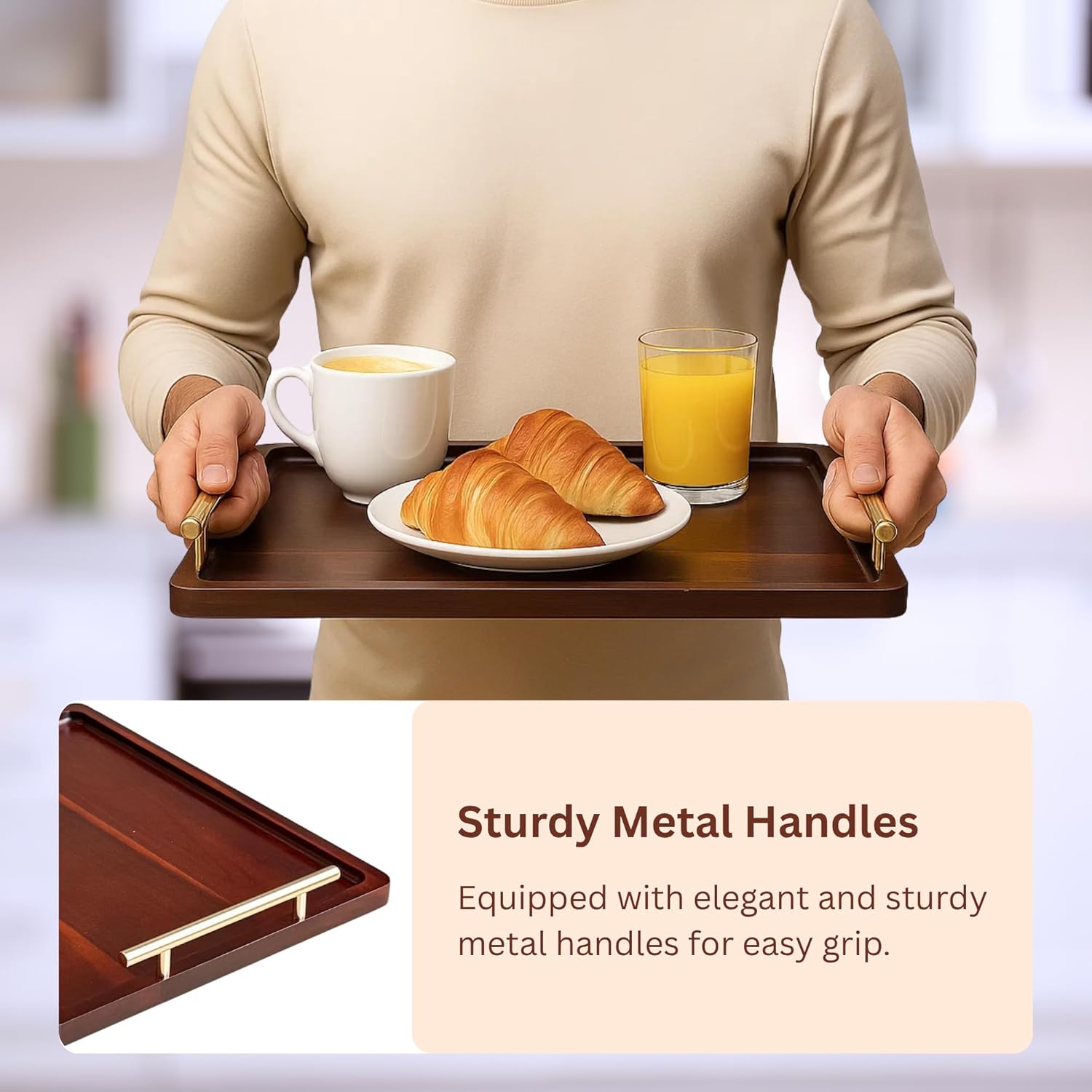 • Metal Handles and Anti-Slip Feet: Our serving tray for ottoman is designed to be both aesthetic and practical. That’s why the wooden serving tray has a lightweight and sturdy construction equipped with durable metal handles for easy carrying and anti-slip rubber feet that prevent the tray from damaging your surfaces.