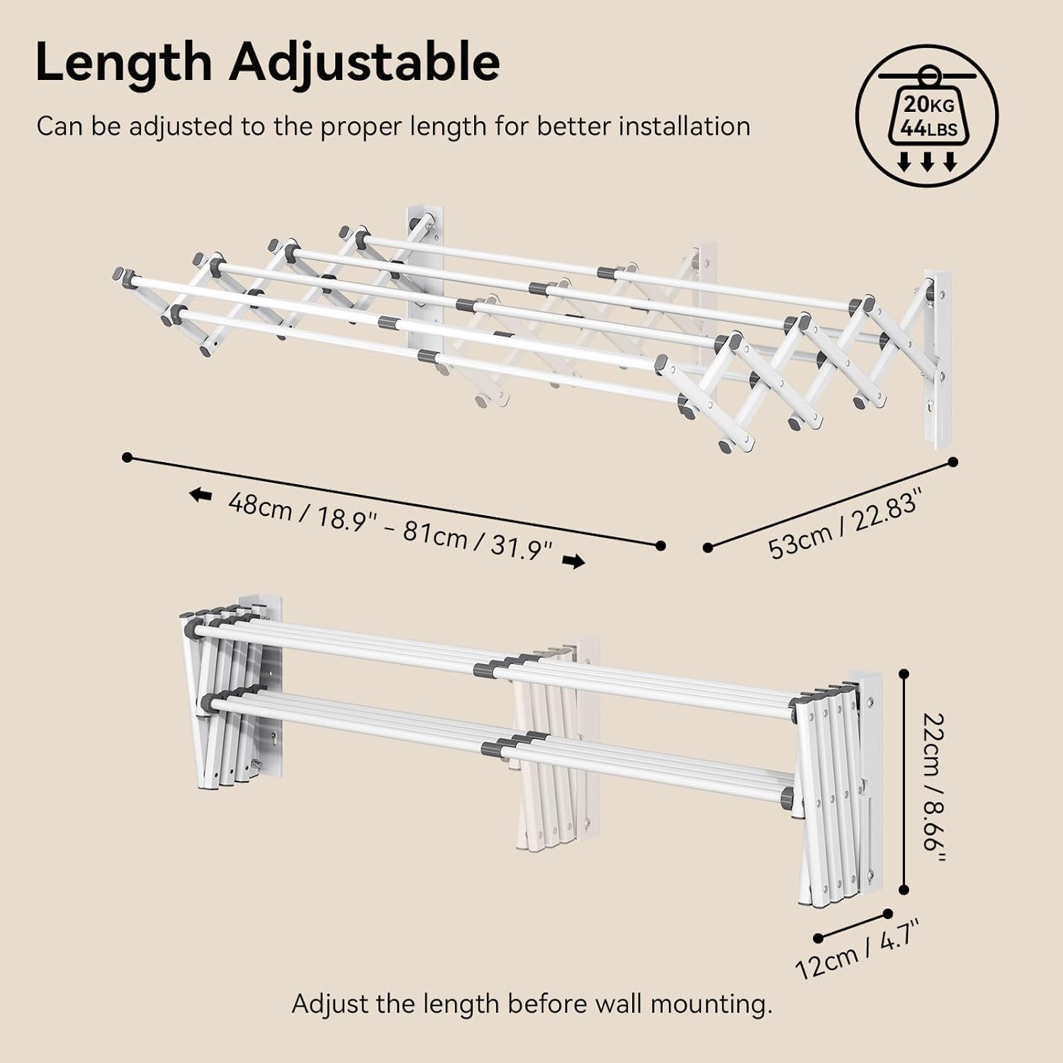• Superior Load Capacity - The wall mounted laundry rack is made from high-quality steel. The drying rack has 8 rails which can support up to 40 lbs clothing under balanced load condition. The reinforced brackets ensure stability.