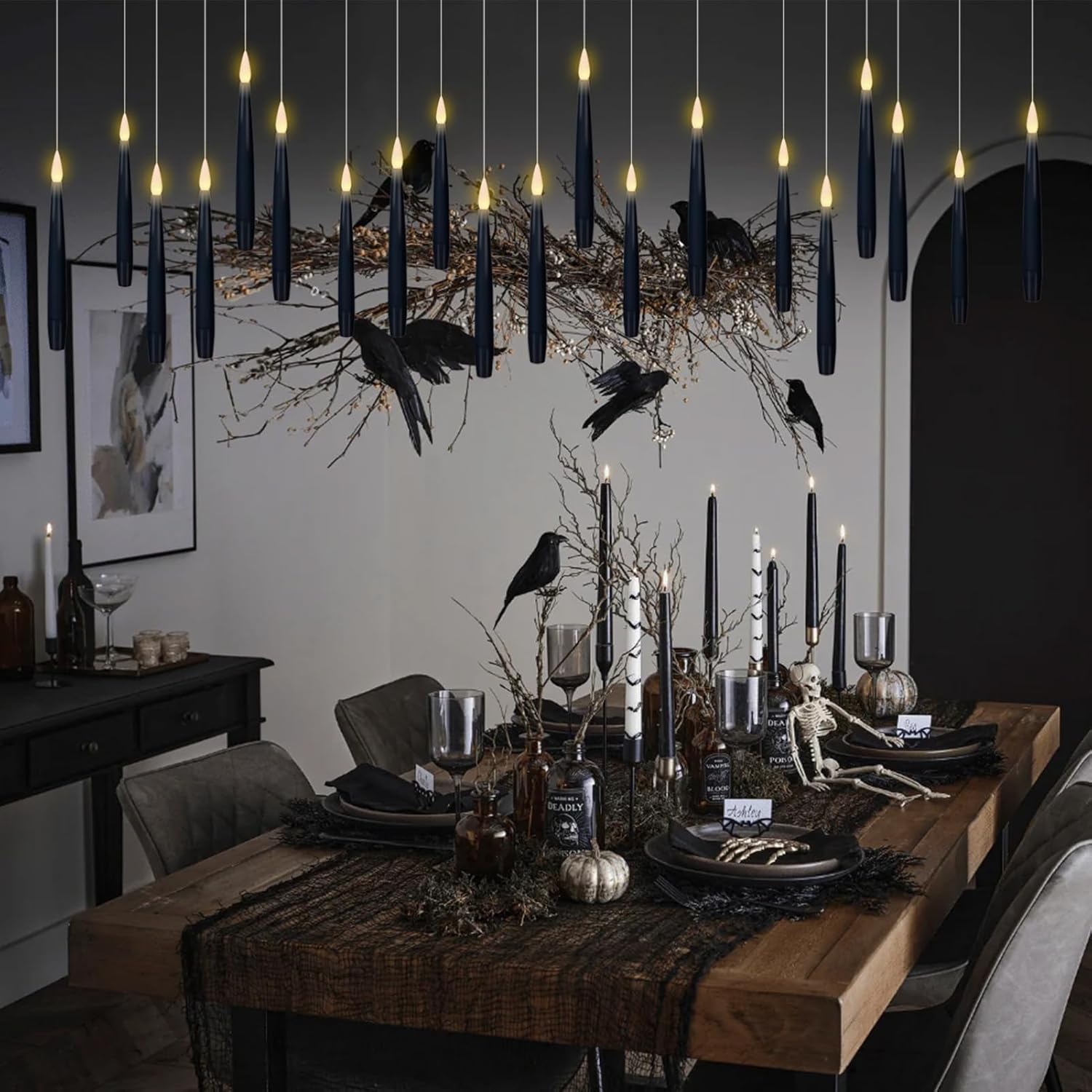 • Hanging candles for Halloween Decoration: This set of flameless candles is equipped with a 4.9ft fishing line(barely visible) pre-attached to these LED taper candles ready to hang. you can easily cut the length you like and thread it through the top, making it easy to hang straight and even. Perfect Halloween decor for holidays, church services, window candles, the fireplace, table, home & outdoor decoration.