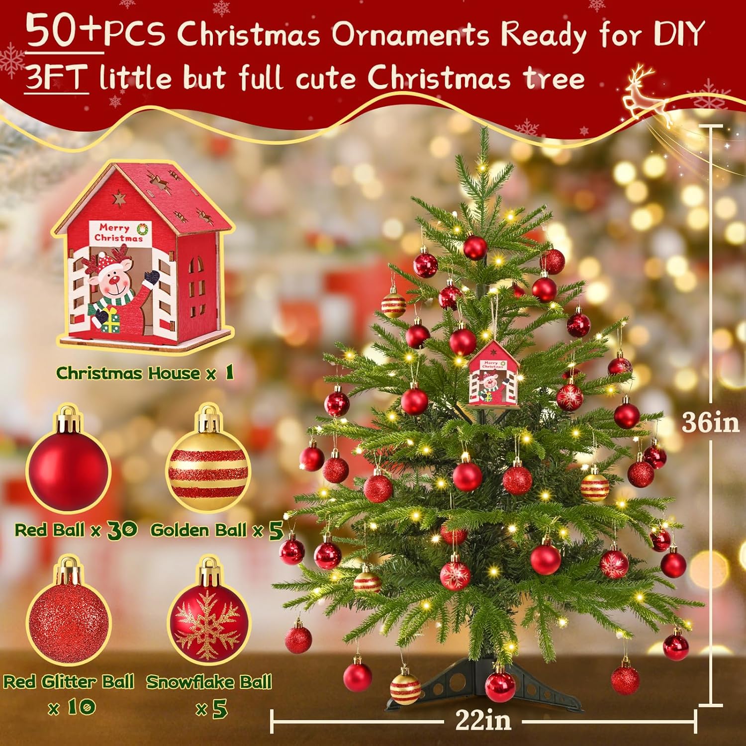 MARTINE MALL 3FT Realistic Norfolk Pine Small Christmas Tree with 50 LED String Light, Full Mini Christmas Tree Artificial Tabletop Xmas Trees with Red Hanging Ball Ornaments for Table Home Holiday
