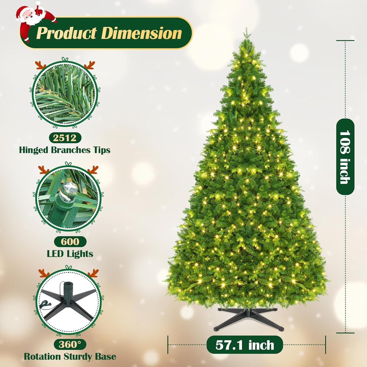 • 9FT Pre-Lit Christmas Tree, Premium Unlit Hinged Design, Easy Assembly in 3 Sections, Foldable Metal Stand, Realistic Look for Home Holiday Decor