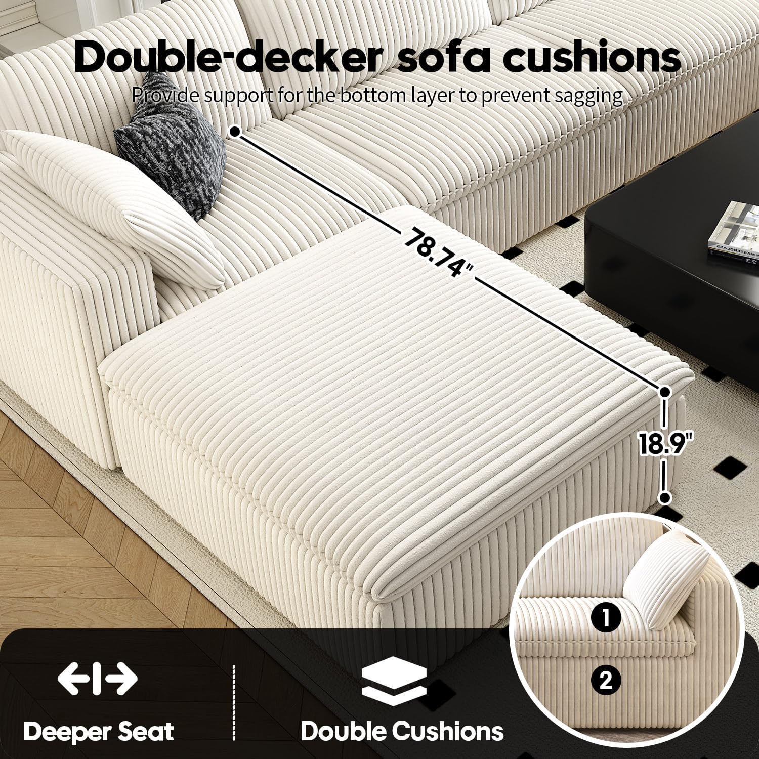 118" Cloud Couch Modular Sectional Sofa for Living Room,Modern Sofa with Deep Seat,U-Shape Boneless Couch with 2 Ottoman,Comfy Upholstered Corduroy Couches for Apartment, Studio, Office,Bedroom,White