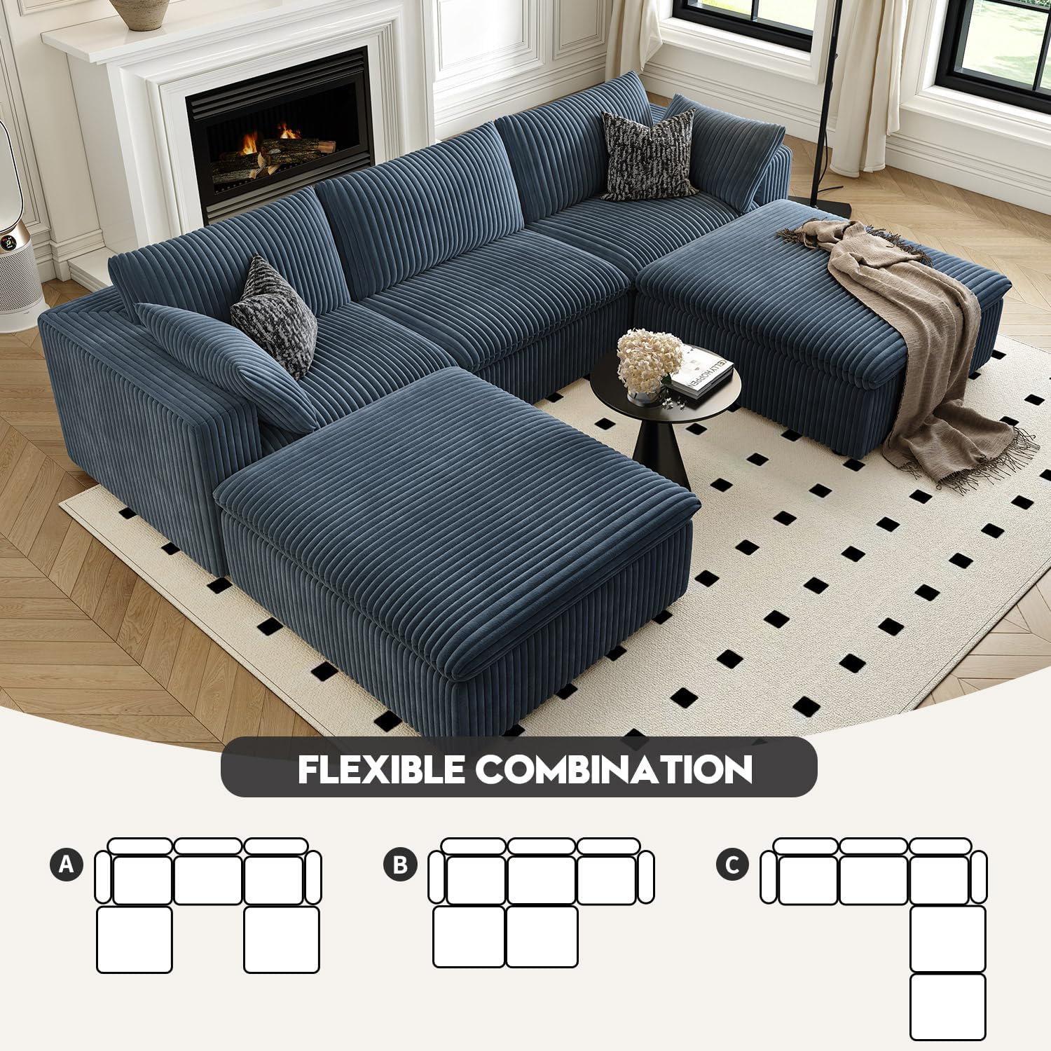 118" Cloud Couch Modular Sectional Sofa for Living Room,Modern Sofa with Deep Seat,U-Shape Boneless Couch with 2 Ottoman,Comfy Upholstered Corduroy Couches for Apartment, Studio, Office,Bedroom,Blue