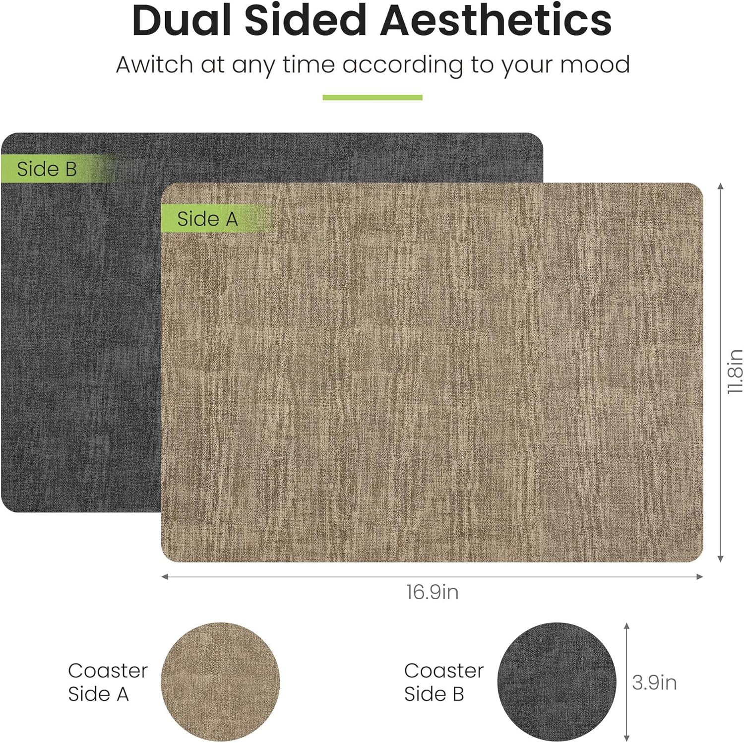 • COST-EFFECTIVE LEATHER PLACEMATS: Our faux leather placemats are made of high quality faux leather, which ensures superior quality and long-lasting durability. Designed with different colours on both sides, it is equivalent to having two different placemats, our placemats are reversible, so you can switch between the two colours at will depending on the occasion or mood. It also comes with a combination of coasters to protect the cups while providing a better dining experience for the diner