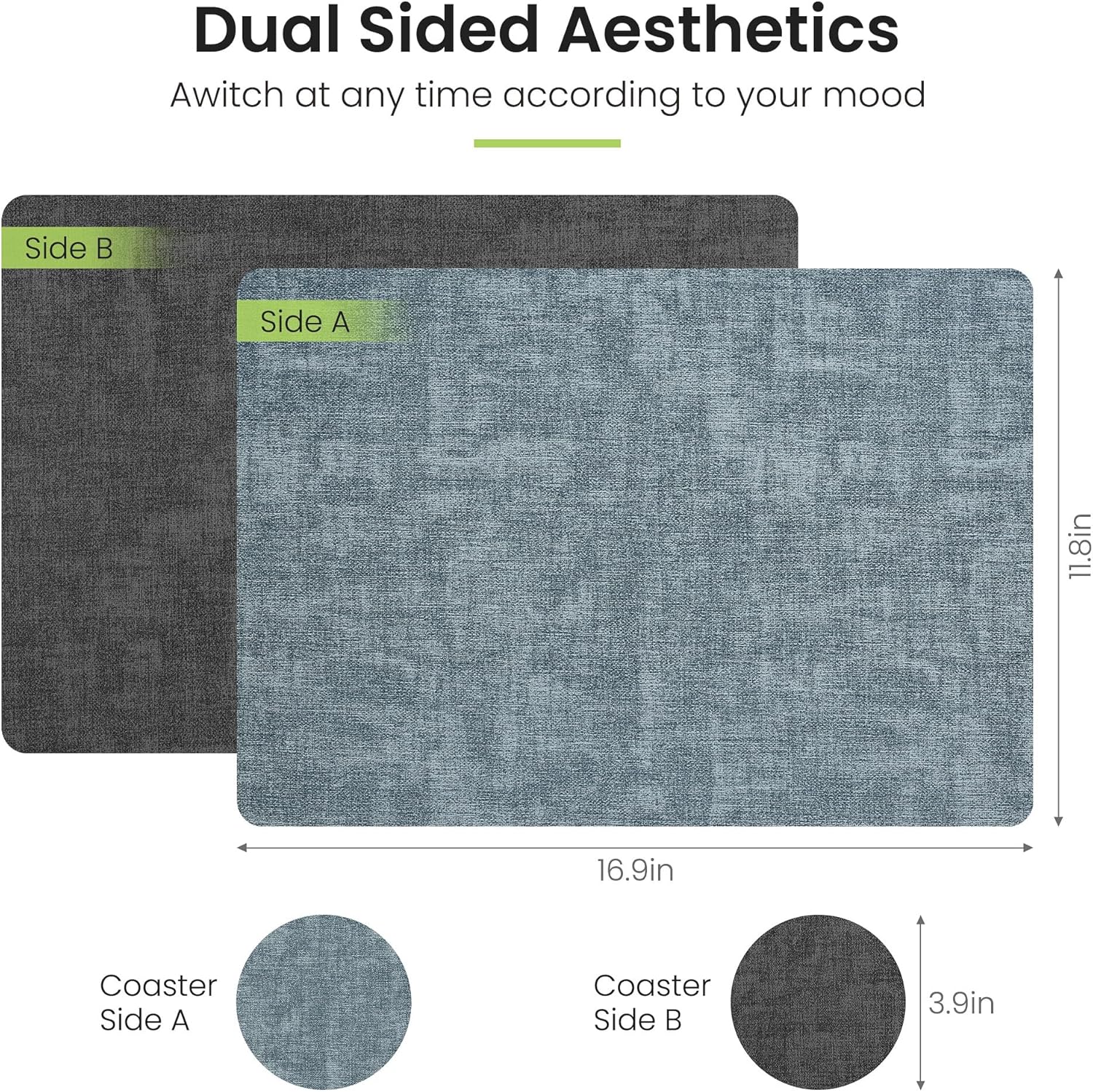 Faux Leather Dual Sided Placemats Set of 6, Square Non-Slip Heat Resistant Placemats with Coaster, Reversible wipeable Waterproof Table Mats for Kitchen, Dining, Outdoor (6, Black Light Blue)