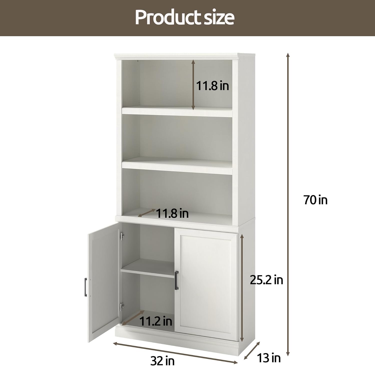 70 Inch Tall Bookcase with Doors, Library Office Bookshelf with Adjustable Shelves, Floor Standing Storage Cabinet for Bedroom Living Room Organizer with Anti Tipping Kit, Soft White Finish
