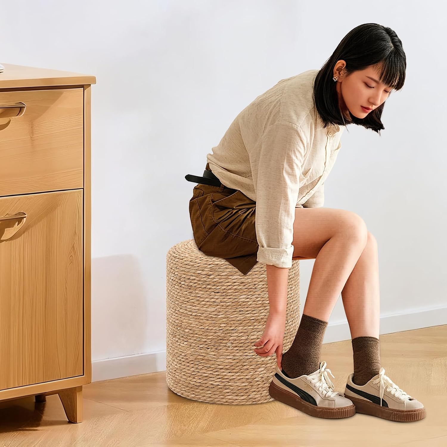 • Artisan Appeal: Handwoven with precision, each piece highlights the unique variations of natural materials, due to natural factors such as sunlight exposure, these stools may have slight differences