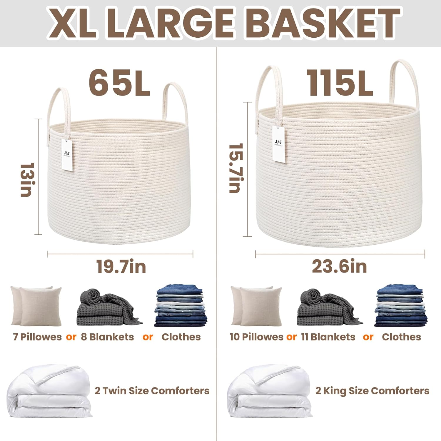 Woven Blanket Basket,115L Large Rope Storage Bin with Handles, Organizer for Blankets Toys Book and Clothes, Laundry Basket for Living Room Bedroom Nursery,White