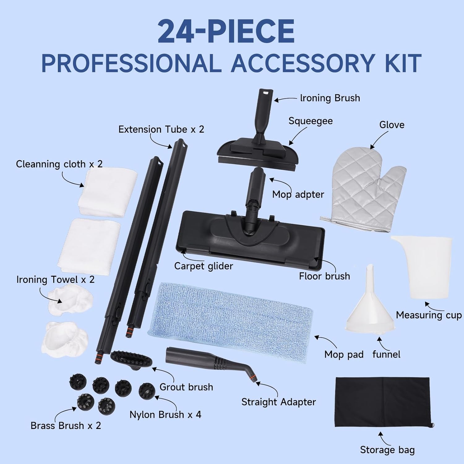 • ALL-IN-ONE WITH 24 MULTI-FUNCTIONAL ACCESSORIES: This versatile multipurpose steam cleaner includes 24 useful attachments: Extension Tube x2, Big Nozzle x1, Mop Adapter x1, Ironing Brush x1, Squeegee x1, Carpet Glider x1, Nylon Brush x4, Brass Brush x2, Plastic Brush x1, Floor Towel x1, Ironing Towel x2, Cleaning Cloth x2, Measuring Cup x1, Funnel x1, Glove x1, Storage Bag x1, transforming it into a multi-surface steam cleaner for walls. With this advanced floor steam cleaner, every corner of your home gets a professional-level clean.