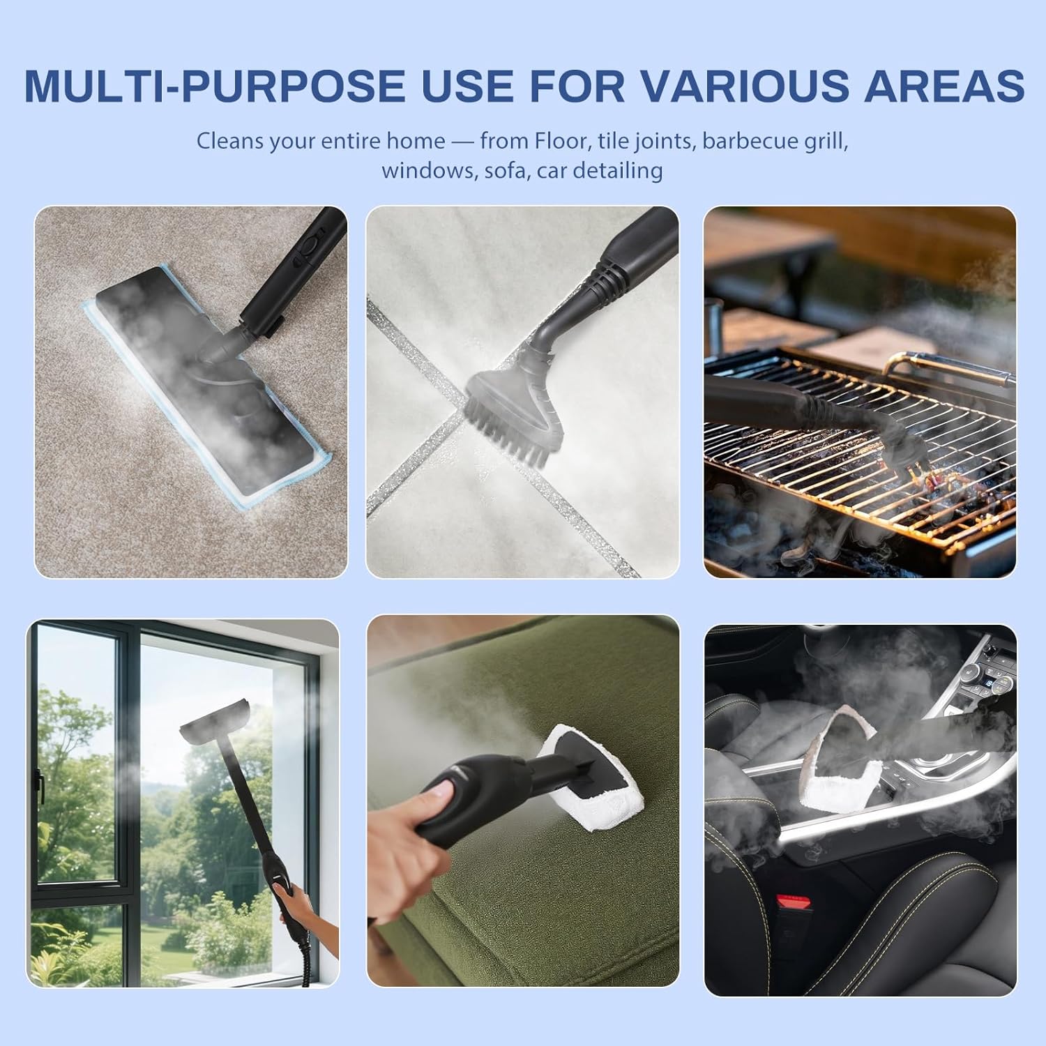 • WIDE APPLICATION FOR ALL CLEANING SCENARIOS: Designed for home use, this multipurpose steam cleaner is ideal for kitchens, bathrooms, floors, carpets, cars, sofas, mattresses, toilets, windows, curtains, walls, ovens, and even clothing. The flexible hose and long power cord provide excellent maneuverability, making this steam cleaner for walls and floor steam cleaner combo your go-to tool for tackling everyday messes or deep-cleaning projects.