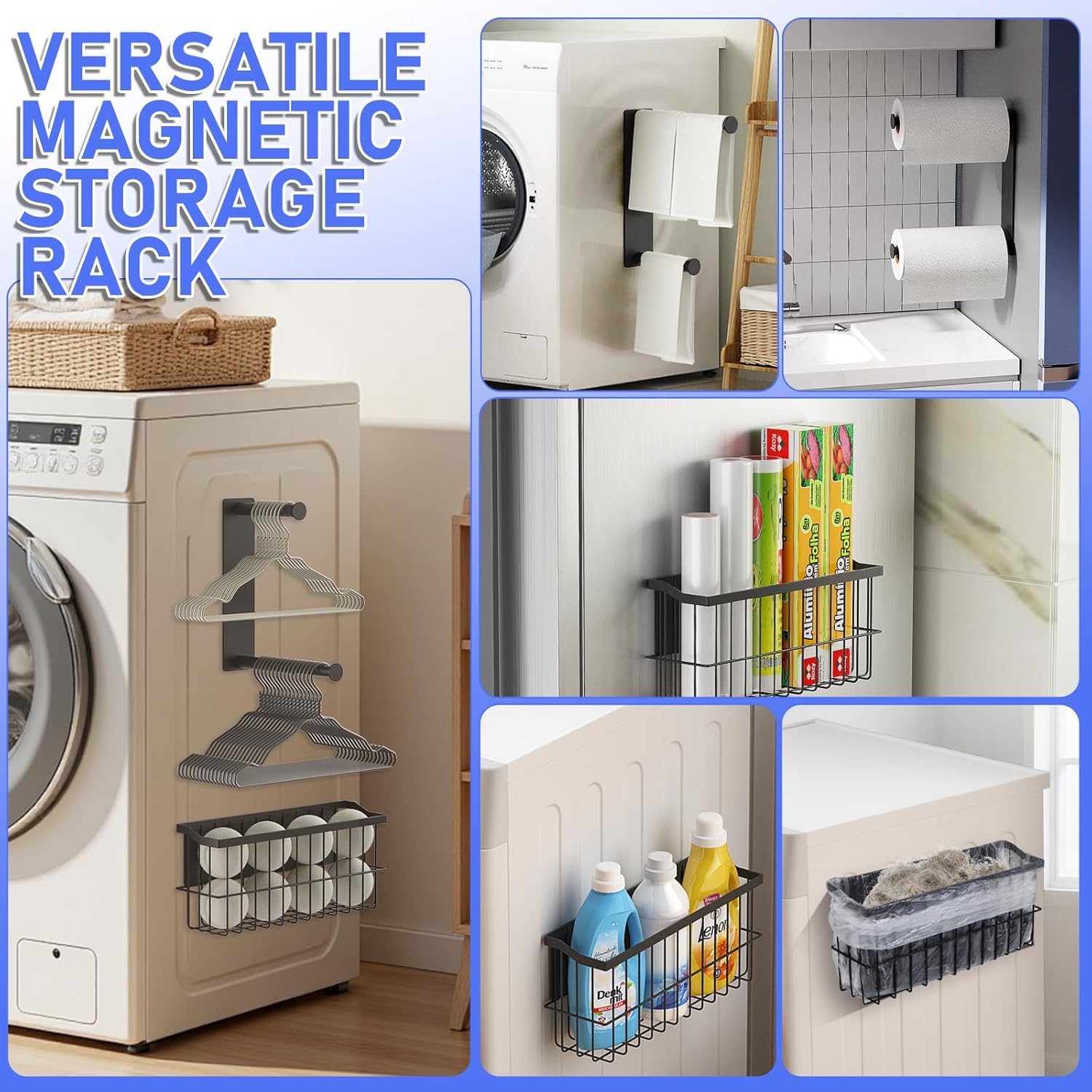 • 【AMAZING MAGNETIC LAUNDRY STORAGE】Upgrade your laundry organization with our New Set Magnetic Hanger Organizer + Storage Basket Set. The powerful magnets adhere instantly to washing machines, dryers, or any metal surface, providing a seamless solution for hanging clothes and storing essentials.