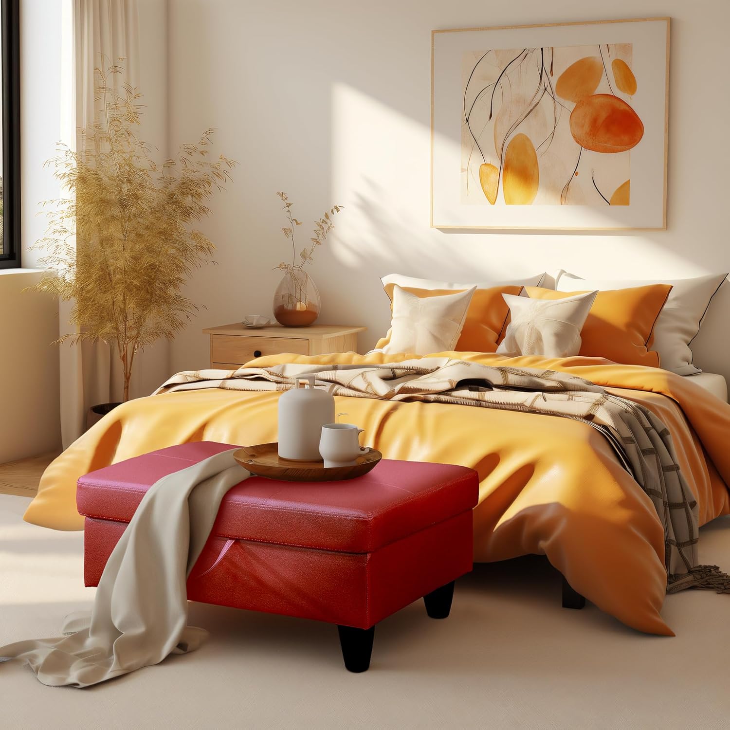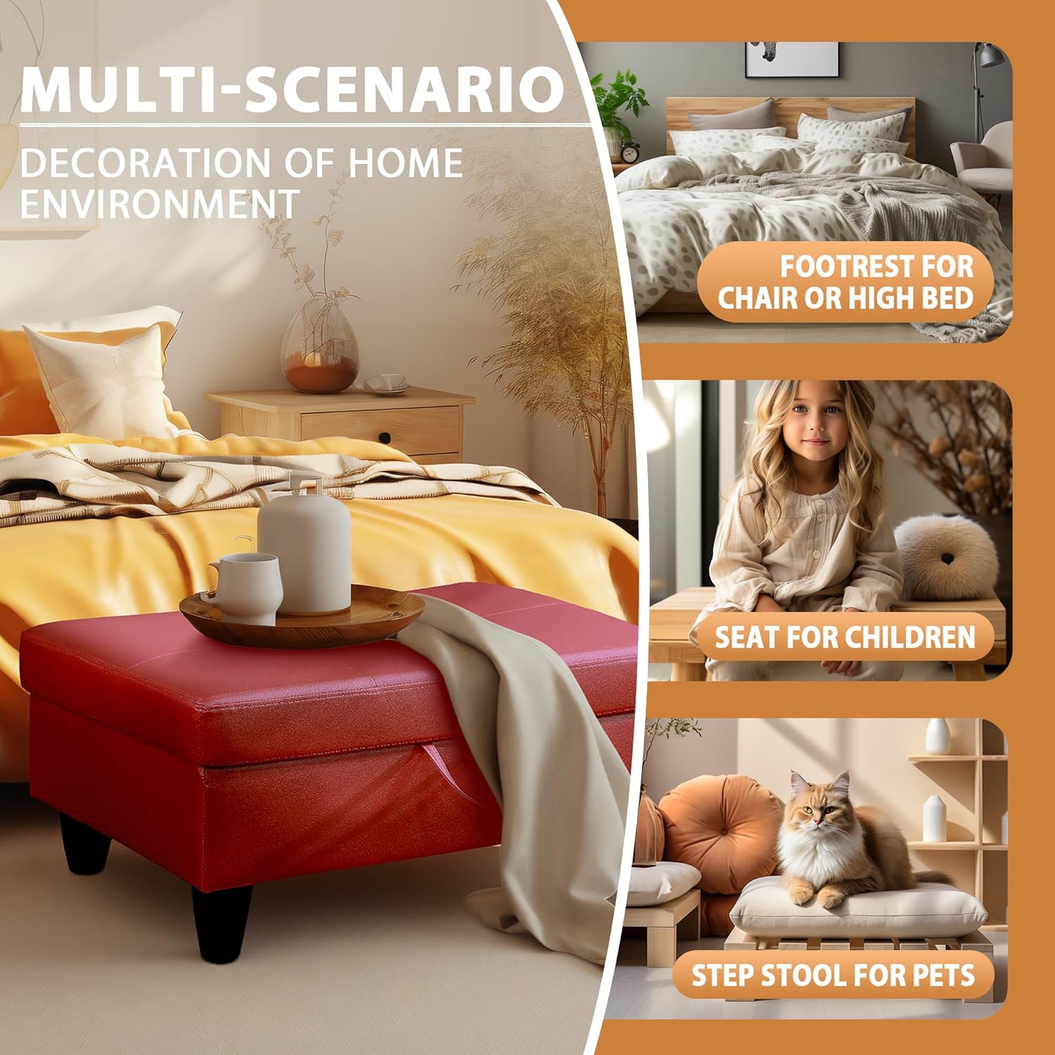 Ottoman Rectangular Storage Ottoman Bench, Faux Leather Footrest, Coffee Table, Stool Footstool with Hinged Lid for Living Room, Bedroom, Entryway, Red, 28.5"x19"x17.5"