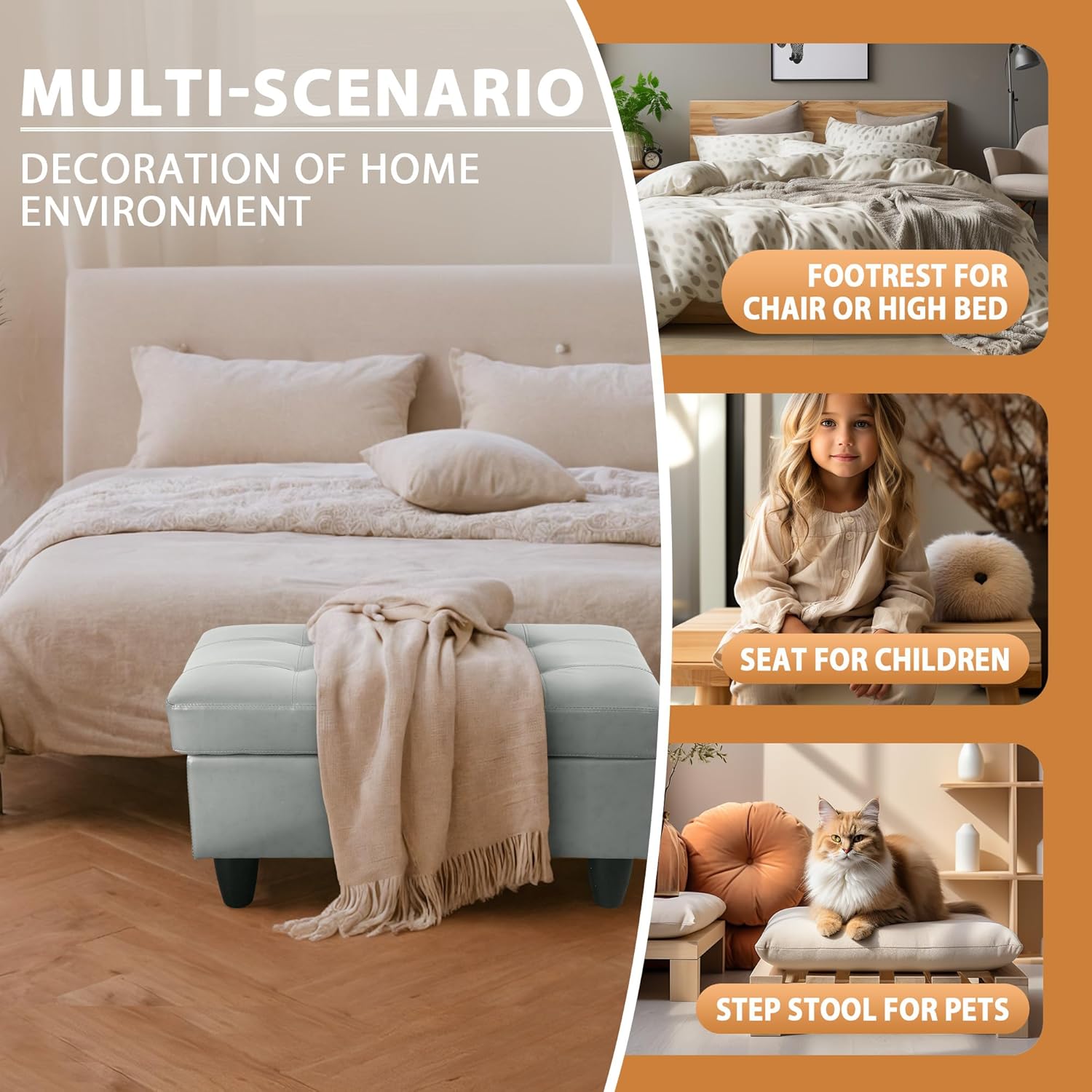 • OTTOMAN BENCH: This versatile storage ottoman doubles as a comfortable bench, perfect for entryways, living rooms, or bedrooms. Designed to blend style with functionality, it provides both extra seating and hidden storage, making it a practical and stylish solution for any space.