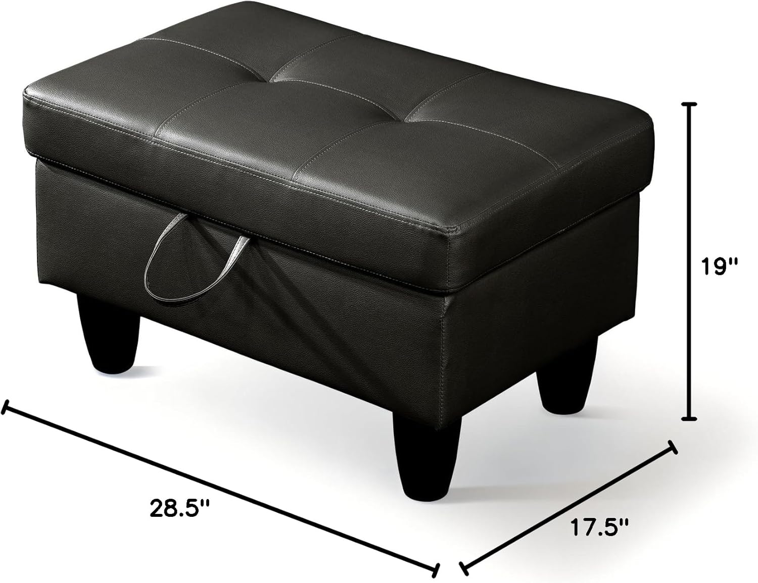 • DIMENSIONS: Measuring 28.5" L x 19" W x 17.5" H, this storage ottoman is perfectly sized to fit effortlessly into your space. With a weight capacity of up to 300 lbs, it offers both style and durability, serving as a sturdy seating option or reliable storage solution for your home.