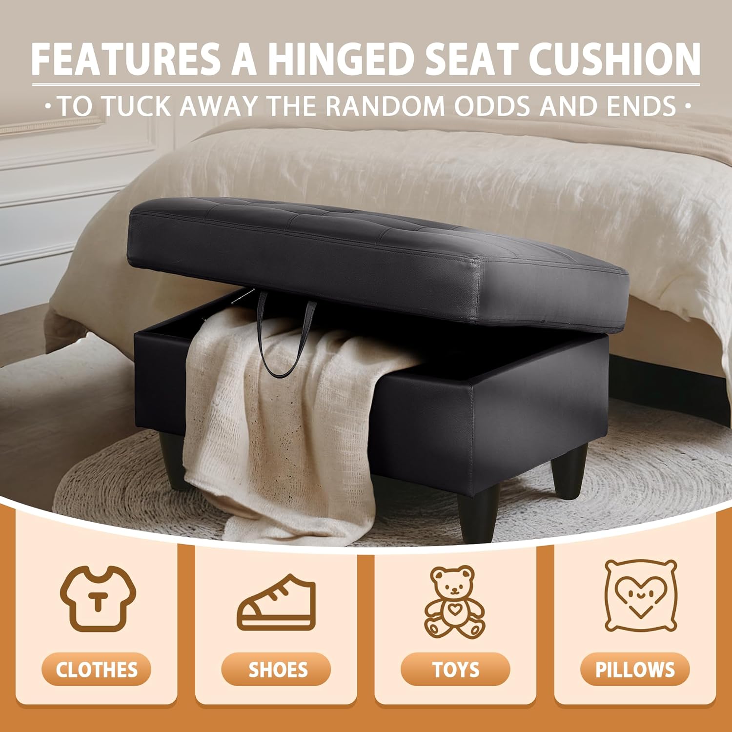 • STORAGE OTTOMAN: This ottoman offers storage space for pillows, blankets, shoes, seasonal items, books, toys, and more. Its hinged design allows the lid to stay open effortlessly and ensures a soft, controlled close. Perfect for organizing and decluttering your living space, this storage ottoman adds both style and functionality to your home.
