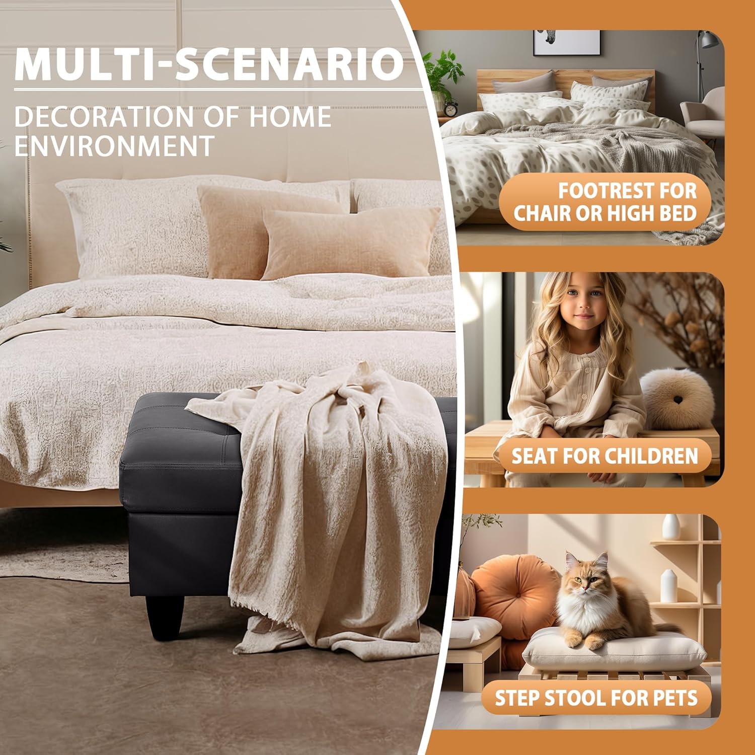 • OTTOMAN BENCH: This versatile storage ottoman doubles as a comfortable bench, perfect for entryways, living rooms, or bedrooms. Designed to blend style with functionality, it provides both extra seating and hidden storage, making it a practical and stylish solution for any space.